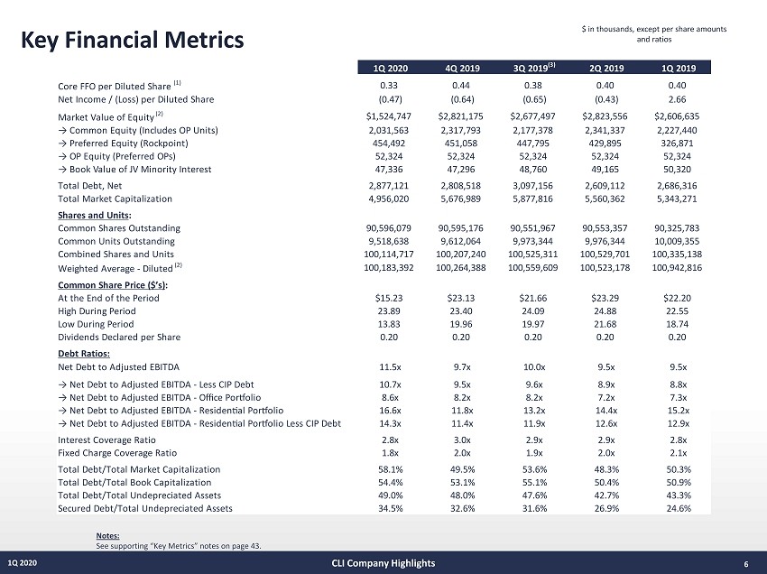 5 1Q 2020 1 Q 2020 Performance Highlights • Achieved Core FFO of $ 33 . 2 million, or $ 0 . 33 per share • Produced AFFO of $ 19 . 8 million • Residential : The stabilized operating portfolio finished 1 Q at 95 . 7 % leased • Office : Leased 173 , 240 square feet of office space ; finished 1 Q at 81 . 1 % leased (excluding Non - Core) 1 Q 2020 Transaction Activity • On January 3 , 2020 , the Company disposed of 230 & 250 Half - Mile Rd . , a land site being developed into a Lifetime Fitness in Middletown, NJ, for a gross price of $ 7 . 6 million • On January 23 , 2020 , the Company increased the size of the loan on Liberty Towers, a residential community in Jersey City, NJ, that was acquired in September 2019 , generating $ 33 . 0 million of excess proceeds • On March 12 , 2020 , the Company acquired its partner’s interest in Riverwalk Retail, a 30 , 745 square - foot building in the Port Imperial North neighborhood of Weehawken, NJ, reflecting a gross value of $ 15 . 2 million • On March 17 , 2020 , the Company disposed of One Bridge Plaza, a 200 , 000 square - foot office building in Fort Lee, NJ, for a gross price of $ 36 . 7 million • On March 27 , 2020 , the Company disposed of Capital Office Park, a land parcel in Greenbelt, MD, for a gross price of $ 9 . 7 million 1 Q 2020 Development Activity • In February 2020 , the Company delivered the first phase of the Emery, a 326 - unit residential development in Malden, MA ; the property is 52 % leased across delivered inventory of 140 units 1 Q 2020 Office Leasing Activity • Completed 51 , 252 square feet of waterfront office leasing, including a partial renewal with Amdocs • Completed 121 , 988 square feet of leasing in the class A suburban, suburban, and non - core portfolios, including a renewal of Franklin Mutual Advisors in Short Hills Liberty Towers, Jersey City, NJ The Capstone (Riverwalk C), West New York, NJ (rendering) Company Achievements CLI Company Highlights