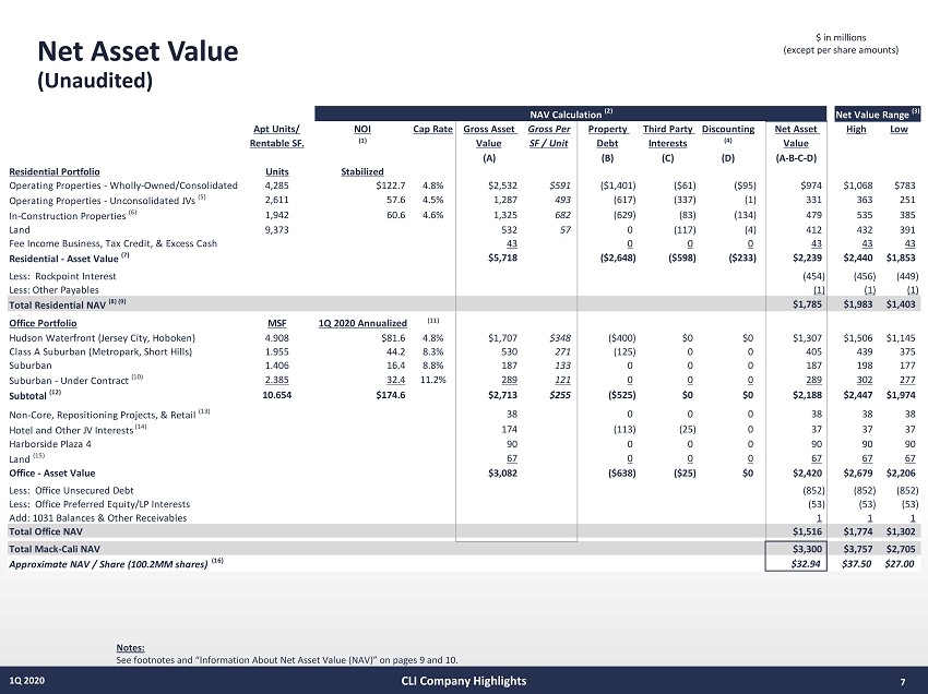 6 1Q 2020 Key Financial Metrics $ in thousands, except per share amounts and ratios Notes: See supporting “Key Metrics” notes on page 43. CLI Company Highlights 1Q 2020 4Q 2019 3Q 2019 (3) 2Q 2019 1Q 2019 Core FFO per Diluted Share (1) 0.33 0.44 0.38 0.40 0.40 Net Income / (Loss) per Diluted Share (0.47) (0.64) (0.65) (0.43) 2.66 Market Value of Equity (2) $1,524,747 $2,821,175 $2,677,497 $2,823,556 $2,606,635 → Common Equity (Includes OP Units) 2,031,563 2,317,793 2,177,378 2,341,337 2,227,440 → Preferred Equity (Rockpoint) 454,492 451,058 447,795 429,895 326,871 → OP Equity (Preferred OPs) 52,324 52,324 52,324 52,324 52,324 → Book Value of JV Minority Interest 47,336 47,296 48,760 49,165 50,320 Total Debt, Net 2,877,121 2,808,518 3,097,156 2,609,112 2,686,316 Total Market Capitalization 4,956,020 5,676,989 5,877,816 5,560,362 5,343,271 Shares and Units: Common Shares Outstanding 90,596,079 90,595,176 90,551,967 90,553,357 90,325,783 Common Units Outstanding 9,518,638 9,612,064 9,973,344 9,976,344 10,009,355 Combined Shares and Units 100,114,717 100,207,240 100,525,311 100,529,701 100,335,138 Weighted Average - Diluted (2) 100,183,392 100,264,388 100,559,609 100,523,178 100,942,816 Common Share Price ($’s): At the End of the Period $15.23 $23.13 $21.66 $23.29 $22.20 High During Period 23.89 23.40 24.09 24.88 22.55 Low During Period 13.83 19.96 19.97 21.68 18.74 Dividends Declared per Share 0.20 0.20 0.20 0.20 0.20 Debt Ratios: Net Debt to Adjusted EBITDA 11.5x 9.7x 10.0x 9.5x 9.5x → Net Debt to Adjusted EBITDA - Less CIP Debt 10.7x 9.5x 9.6x 8.9x 8.8x → Net Debt to Adjusted EBITDA - Office Portfolio 8.6x 8.2x 8.2x 7.2x 7.3x → Net Debt to Adjusted EBITDA - Residential Portfolio 16.6x 11.8x 13.2x 14.4x 15.2x → Net Debt to Adjusted EBITDA - Residential Portfolio Less CIP Debt 14.3x 11.4x 11.9x 12.6x 12.9x Interest Coverage Ratio 2.8x 3.0x 2.9x 2.9x 2.8x Fixed Charge Coverage Ratio 1.8x 2.0x 1.9x 2.0x 2.1x Total Debt/Total Market Capitalization 58.1% 49.5% 53.6% 48.3% 50.3% Total Debt/Total Book Capitalization 54.4% 53.1% 55.1% 50.4% 50.9% Total Debt/Total Undepreciated Assets 49.0% 48.0% 47.6% 42.7% 43.3% Secured Debt/Total Undepreciated Assets 34.5% 32.6% 31.6% 26.9% 24.6%