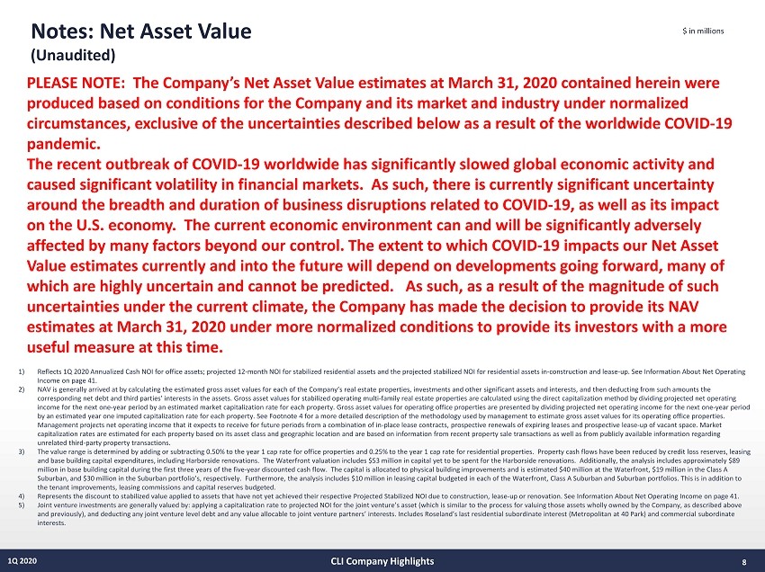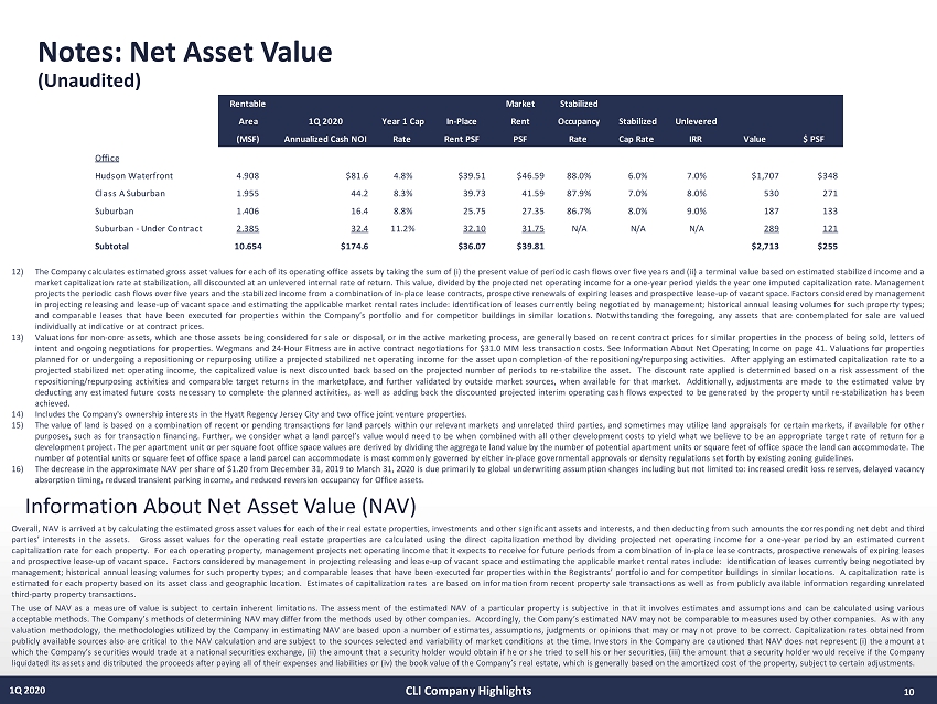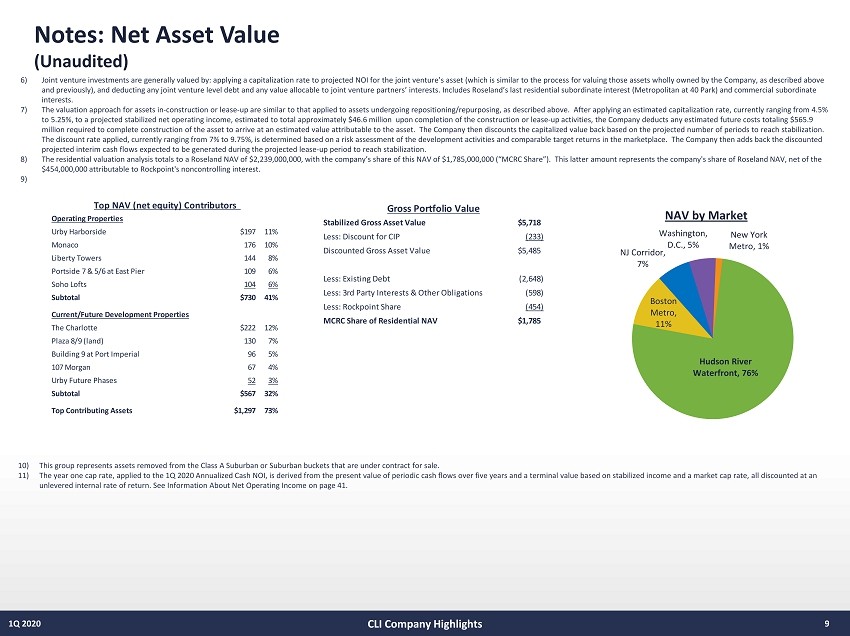 Notes: Net Asset Value (Unaudited) 8 1Q 2020 $ in millions CLI Company Highlights 1) Reflects 1Q 2020 Annualized Cash NOI for office assets; projected 12 - month NOI for stabilized residential assets and the project ed stabilized NOI for residential assets in - construction and lease - up. See Information About Net Operating Income on page 41. 2) NAV is generally arrived at by calculating the estimated gross asset values for each of the Company’s real estate properties, in vestments and other significant assets and interests, and then deducting from such amounts the corresponding net debt and third parties’ interests in the assets. Gross asset values for stabilized operating multi - family real estate properties are calculated using the direct capitalization method by dividing projected net operating income for the next one - year period by an estimated market capitalization rate for each property. Gross asset values for operati ng office properties are presented by dividing projected net operating income for the next one - year period by an estimated year one imputed capitalization rate for each property. See Footnote 4 for a more detailed description of the me thodology used by management to estimate gross asset values for its operating office properties. Management projects net operating income that it expects to receive for future periods from a combination of in - place lease cont racts, prospective renewals of expiring leases and prospective lease - up of vacant space. Market capitalization rates are estimated for each property based on its asset class and geographic location and are based on inform ati on from recent property sale transactions as well as from publicly available information regarding unrelated third - party property transactions. 3) The value range is determined by adding or subtracting 0.50% to the year 1 cap rate for office properties and 0.25% to the ye ar 1 cap rate for residential properties. Property cash flows have been reduced by credit loss reserves, leasing and base building capital expenditures, including Harborside renovations. The Waterfront valuation includes $53 million in c api tal yet to be spent for the Harborside renovations. Additionally, the analysis includes approximately $89 million in base building capital during the first three years of the five - year discounted cash flow. The capital is allocated t o physical building improvements and is estimated $40 million at the Waterfront, $19 million in the Class A Suburban, and $30 million in the Suburban portfolio’s, respectively. Furthermore, the analysis includes $10 million in leasi ng capital budgeted in each of the Waterfront, Class A Suburban and Suburban portfolios. This is in addition to the tenant improvements, leasing commissions and capital reserves budgeted. 4) Represents the discount to stabilized value applied to assets that have not yet achieved their respective Projected Stabilize d N OI due to construction, lease - up or renovation. See Information About Net Operating Income on page 41. 5) Joint venture investments are generally valued by: applying a capitalization rate to projected NOI for the joint venture’s as set (which is similar to the process for valuing those assets wholly owned by the Company, as described above and previously), and deducting any joint venture level debt and any value allocable to joint venture partners’ interests. Inc lud es Roseland’s last residential subordinate interest (Metropolitan at 40 Park) and commercial subordinate interests. PLEASE NOTE: The Company’s Net Asset Value estimates at March 31, 2020 contained herein were produced based on conditions for the Company and its market and industry under normalized circumstances, exclusive of the uncertainties described below as a result of the worldwide COVID - 19 pandemic. The recent outbreak of COVID - 19 worldwide has significantly slowed global economic activity and caused significant volatility in financial markets. As such, there is currently significant uncertainty around the breadth and duration of business disruptions related to COVID - 19, as well as its impact on the U.S. economy. The current economic environment can and will be significantly adversely affected by many factors beyond our control. The extent to which COVID - 19 impacts our Net Asset Value estimates currently and into the future will depend on developments going forward, many of which are highly uncertain and cannot be predicted. As such, as a result of the magnitude of such uncertainties under the current climate, the Company has made the decision to provide its NAV estimates at March 31, 2020 under more normalized conditions to provide its investors with a more useful measure at this time.