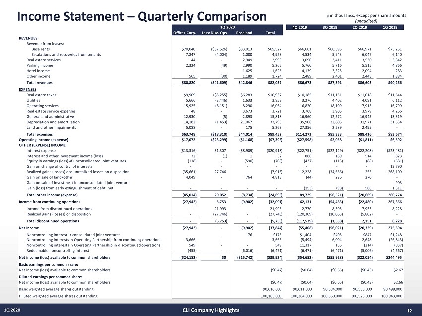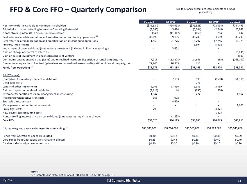 12 1Q 2020 Income Statement – Quarterly Comparison $ in thousands, except per share amounts (unaudited) CLI Company Highlights 4Q 2019 3Q 2019 2Q 2019 1Q 2019 Office/ Corp. Less: Disc. Ops Roseland Total REVENUES Revenue from leases: Base rents $70,040 ($37,526) $33,013 $65,527 $66,661 $66,595 $66,971 $73,251 Escalations and recoveries from tenants 7,847 (4,004) 1,080 4,923 4,534 5,943 6,047 6,140 Real estate services 44 - 2,949 2,993 3,090 3,411 3,530 3,842 Parking income 2,324 (49) 2,990 5,265 5,760 5,716 5,515 4,866 Hotel income - - 1,625 1,625 4,139 3,325 2,094 283 Other income 565 (30) 1,189 1,724 2,489 2,401 2,448 1,884 Total revenues $80,820 ($41,609) $42,846 $82,057 $86,673 $87,391 $86,605 $90,266 EXPENSES Real estate taxes $9,909 ($5,255) $6,283 $10,937 $10,185 $11,151 $11,018 $11,644 Utilities 5,666 (3,446) 1,633 3,853 3,276 4,402 4,091 6,112 Operating services 15,925 (8,151) 8,290 16,064 16,820 18,109 17,913 16,799 Real estate service expenses 48 - 3,673 3,721 3,768 3,905 3,979 4,266 General and administrative 12,930 (5) 2,893 15,818 16,960 12,572 16,945 13,319 Depreciation and amortization 14,182 (1,453) 21,067 33,796 35,906 32,605 31,971 31,534 Land and other impairments 5,088 - 175 5,263 27,356 2,589 2,499 - Total expenses $63,748 ($18,310) $44,014 $89,452 $114,271 $85,333 $88,416 $83,674 Operating Income (expense) $17,072 ($23,299) ($1,168) ($7,395) ($27,598) $2,058 ($1,811) $6,592 OTHER (EXPENSE) INCOME Interest expense ($13,316) $1,307 ($8,909) ($20,918) ($22,751) ($22,129) ($22,208) ($23,481) Interest and other investment income (loss) 32 (1) 1 32 886 189 514 823 Equity in earnings (loss) of unconsolidated joint ventures (118) - (590) (708) (437) (113) (88) (681) Gain on change of control of interests - - - - - - - 13,790 Realized gains (losses) and unrealized losses on disposition (35,661) 27,746 - (7,915) 112,228 (34,666) 255 268,109 Gain on sale of land/other 4,049 - 764 4,813 (44) 296 270 - Gain on sale of investment in unconsolidated joint venture - - - - - - - 903 Gain (loss) from early extinguishment of debt, net - - - - (153) (98) 588 1,311 Total other income (expense) (45,014) 29,052 (8,734) (24,696) 89,729 (56,521) (20,669) 260,774 Income from continuing operations (27,942) 5,753 (9,902) (32,091) 62,131 (54,463) (22,480) 267,366 Income from discontinued operations - 21,993 - 21,993 2,770 8,505 7,953 8,228 Realized gains (losses) on disposition - (27,746) - (27,746) (120,309) (10,063) (5,802) - Total discontinued operations - (5,753) - (5,753) (117,539) (1,558) 2,151 8,228 Net Income (27,942) - (9,902) (37,844) (55,408) (56,021) (20,329) 275,594 Noncontrolling interest in consolidated joint ventures - - 176 $176 $1,404 $405 $847 $1,248 Noncontrolling interests in Operating Partnership from continuing operations 3,666 - - 3,666 (5,494) 6,004 2,648 (26,843) Noncontrolling interests in Operating Partnership in discontinued operations 549 - - 549 11,317 155 (214) (837) Redeemable noncontrolling interest (455) - (6,016) (6,471) (6,471) (6,471) (5,006) (4,667) Net income (loss) available to common shareholders ($24,182) $0 ($15,742) ($39,924) ($54,652) ($55,928) ($22,054) $244,495 Basic earnings per common share: Net income (loss) available to common shareholders ($0.47) ($0.64) ($0.65) ($0.43) $2.67 Diluted earnings per common share: Net income (loss) available to common shareholders ($0.47) ($0.64) ($0.65) ($0.43) $2.66 Basic weighted average shares outstanding 90,616,000 90,611,000 90,584,000 90,533,000 90,498,000 Diluted weighted average shares outstanding 100,183,000 100,264,000 100,560,000 100,523,000 100,943,000 1Q 2020