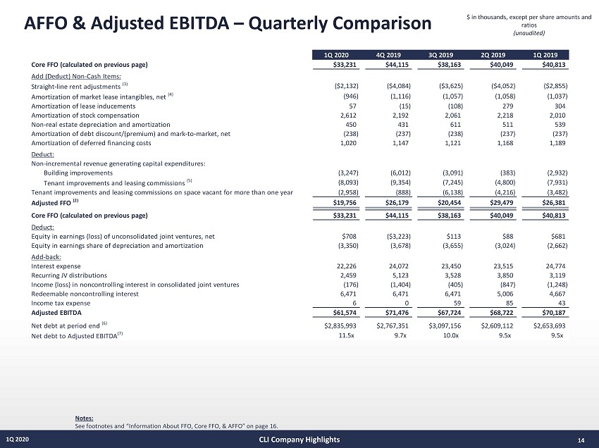 FFO & Core FFO – Quarterly Comparison 13 1Q 2020 $ in thousands, except per share amounts and ratios (unaudited) Notes: See footnotes and “Information About FFO, Core FFO, & AFFO” on page 16. CLI Company Highlights 1Q 2020 4Q 2019 3Q 2019 2Q 2019 1Q 2019 Net income (loss) available to common shareholders ($39,924) ($54,652) ($55,928) ($22,054) $244,495 Add (deduct): Noncontrolling interest in Operating Partnership (3,666) 5,494 (6,004) (2,648) 26,843 Noncontrolling interests in discontinued operations (549) (11,317) (155) 214 837 Real estate-related depreciation and amortization on continuing operations (1) 36,696 39,155 35,785 34,619 33,793 Real estate-related depreciation and amortization on discontinued operations 1,453 21,776 16,797 17,246 16,375 Property impairments - - 5,894 5,802 - Impairment of unconsolidated joint venture investment (included in Equity in earnings) - 3,661 - - - Gain on change of control of interests - - - - (13,790) Gain on sale of investment in unconsolidated joint venture - - - - (903) Continuing operations: Realized (gains) and unrealized losses on disposition of rental property, net 7,915 (112,228) 34,666 (255) (268,109) Discontinued operations: Realized (gains) loss and unrealized losses on disposition of rental property, net 27,746 120,309 413 - - Funds from operations (2) $29,671 $12,198 $31,468 $32,924 $39,541 Add/(Deduct): (Gain)/Loss from extinguishment of debt, net - $153 $98 ($588) ($1,311) Dead deal costs - - 271 - - Land and other impairments 5,263 27,356 6,345 2,499 - Gain on disposition of developable land (4,813) 44 (296) (270) - Severance/separation costs on management restructuring 1,947 - 277 - 1,562 Reporting system conversion costs 363 998 - - - Strategic direction costs - 4,629 - - - Management contract termination costs - - - - 1,021 Proxy fight costs 799 - - 4,171 - New payroll tax consulting costs - - - 1,313 - Noncontrolling interest share on consolidated joint ventures impairment charges (1,263) - - - Core FFO $33,320 $44,115 $38,163 $40,049 $40,813 Diluted weighted average shares/units outstanding (8) 100,183,000 100,264,000 100,560,000 100,523,000 100,943,000 Funds from operations per share-diluted $0.30 $0.12 $0.31 $0.33 $0.39 Core Funds from Operations per share/unit-diluted $0.33 $0.44 $0.38 $0.40 $0.40 Dividends declared per common share $0.20 $0.20 $0.20 $0.20 $0.20