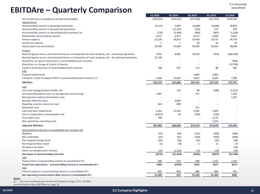 AFFO & Adjusted EBITDA – Quarterly Comparison 14 1Q 2020 $ in thousands, except per share amounts and ratios (unaudited) Notes: See footnotes and “Information About FFO, Core FFO, & AFFO” on page 16. CLI Company Highlights 1Q 2020 4Q 2019 3Q 2019 2Q 2019 1Q 2019 Core FFO (calculated on previous page) $33,231 $44,115 $38,163 $40,049 $40,813 Add (Deduct) Non-Cash Items: Straight-line rent adjustments (3) ($2,132) ($4,084) ($3,625) ($4,052) ($2,855) Amortization of market lease intangibles, net (4) (946) (1,116) (1,057) (1,058) (1,037) Amortization of lease inducements 57 (15) (108) 279 304 Amortization of stock compensation 2,612 2,192 2,061 2,218 2,010 Non-real estate depreciation and amortization 450 431 611 511 539 Amortization of debt discount/(premium) and mark-to-market, net (238) (237) (238) (237) (237) Amortization of deferred financing costs 1,020 1,147 1,121 1,168 1,189 Deduct: Non-incremental revenue generating capital expenditures: Building improvements (3,247) (6,012) (3,091) (383) (2,932) Tenant improvements and leasing commissions (5) (8,093) (9,354) (7,245) (4,800) (7,931) Tenant improvements and leasing commissions on space vacant for more than one year (2,958) (888) (6,138) (4,216) (3,482) Adjusted FFO (2) $19,756 $26,179 $20,454 $29,479 $26,381 Core FFO (calculated on previous page) $33,231 $44,115 $38,163 $40,049 $40,813 Deduct: Equity in earnings (loss) of unconsolidated joint ventures, net $708 ($3,223) $113 $88 $681 Equity in earnings share of depreciation and amortization (3,350) (3,678) (3,655) (3,024) (2,662) Add-back: Interest expense 22,226 24,072 23,450 23,515 24,774 Recurring JV distributions 2,459 5,123 3,528 3,850 3,119 Income (loss) in noncontrolling interest in consolidated joint ventures (176) (1,404) (405) (847) (1,248) Redeemable noncontrolling interest 6,471 6,471 6,471 5,006 4,667 Income tax expense 6 0 59 85 43 Adjusted EBITDA $61,574 $71,476 $67,724 $68,722 $70,187 Net debt at period end (6) $2,835,993 $2,767,351 $3,097,156 $2,609,112 $2,653,693 Net debt to Adjusted EBITDA (7) 11.5x 9.7x 10.0x 9.5x 9.5x