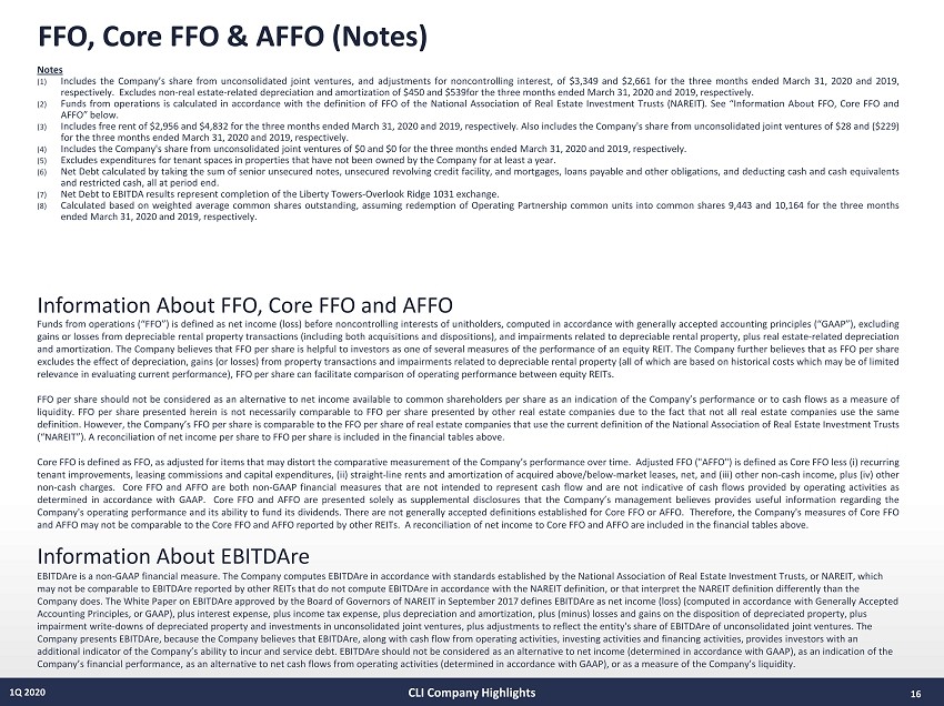 FFO, Core FFO & AFFO (Notes) 16 1Q 2020 Notes (1) Includes the Company’s share from unconsolidated joint ventures, and adjustments for noncontrolling interest, of $ 3 , 349 and $ 2 , 661 for the three months ended March 31 , 2020 and 2019 , respectively . Excludes non - real estate - related depreciation and amortization of $ 450 and $ 539 for the three months ended March 31 , 2020 and 2019 , respectively . (2) Funds from operations is calculated in accordance with the definition of FFO of the National Association of Real Estate Investment Trusts (NAREIT) . See “Information About FFO, Core FFO and AFFO” below . (3) Includes free rent of $ 2 , 956 and $ 4 , 832 for the three months ended March 31 , 2020 and 2019 , respectively . Also includes the Company's share from unconsolidated joint ventures of $ 28 and ( $ 229 ) for the three months ended March 31 , 2020 and 2019 , respectively . (4) Includes the Company's share from unconsolidated joint ventures of $ 0 and $ 0 for the three months ended March 31 , 2020 and 2019 , respectively . (5) Excludes expenditures for tenant spaces in properties that have not been owned by the Company for at least a year . (6) Net Debt calculated by taking the sum of senior unsecured notes, unsecured revolving credit facility, and mortgages, loans payable and other obligations, and deducting cash and cash equivalents and restricted cash, all at period end . (7) Net Debt to EBITDA results represent completion of the Liberty Towers - Overlook Ridge 1031 exchange . (8) Calculated based on weighted average common shares outstanding, assuming redemption of Operating Partnership common units into common shares 9 , 443 and 10 , 164 for the three months ended March 31 , 2020 and 2019 , respectively . Funds from operations (“FFO”) is defined as net income (loss) before noncontrolling interests of unitholders, computed in accordance with generally accepted accounting principles (“GAAP”), excluding gains or losses from depreciable rental property transactions (including both acquisitions and dispositions), and impairments related to depreciable rental property, plus real estate - related depreciation and amortization . The Company believes that FFO per share is helpful to investors as one of several measures of the performance of an equity REIT . The Company further believes that as FFO per share excludes the effect of depreciation, gains (or losses) from property transactions and impairments related to depreciable rental property (all of which are based on historical costs which may be of limited relevance in evaluating current performance), FFO per share can facilitate comparison of operating performance between equity REITs . FFO per share should not be considered as an alternative to net income available to common shareholders per share as an indication of the Company’s performance or to cash flows as a measure of liquidity . FFO per share presented herein is not necessarily comparable to FFO per share presented by other real estate companies due to the fact that not all real estate companies use the same definition . However, the Company’s FFO per share is comparable to the FFO per share of real estate companies that use the current definition of the National Association of Real Estate Investment Trusts (“NAREIT”) . A reconciliation of net income per share to FFO per share is included in the financial tables above . Core FFO is defined as FFO, as adjusted for items that may distort the comparative measurement of the Company’s performance over time . Adjusted FFO ("AFFO") is defined as Core FFO less ( i ) recurring tenant improvements, leasing commissions and capital expenditures, (ii) straight - line rents and amortization of acquired above/below - market leases, net, and (iii) other non - cash income, plus (iv) other non - cash charges . Core FFO and AFFO are both non - GAAP financial measures that are not intended to represent cash flow and are not indicative of cash flows provided by operating activities as determined in accordance with GAAP . Core FFO and AFFO are presented solely as supplemental disclosures that the Company’s management believes provides useful information regarding the Company's operating performance and its ability to fund its dividends . There are not generally accepted definitions established for Core FFO or AFFO . Therefore, the Company's measures of Core FFO and AFFO may not be comparable to the Core FFO and AFFO reported by other REITs . A reconciliation of net income to Core FFO and AFFO are included in the financial tables above . Information About FFO, Core FFO and AFFO EBITDAre is a non - GAAP financial measure. The Company computes EBITDAre in accordance with standards established by the National Association of Real Estate Investment Trusts, or NAREIT, which may not be comparable to EBITDAre reported by other REITs that do not compute EBITDAre in accordance with the NAREIT definition, or that interpret the NAREIT definition differently than the Company does. The White Paper on EBITDAre approved by the Board of Governors of NAREIT in September 2017 defines EBITDAre as net income (loss) (computed in accordance with Generally Accepted Accounting Principles, or GAAP), plus interest expense, plus income tax expense, plus depreciation and amortization, plus (mi nus ) losses and gains on the disposition of depreciated property, plus impairment write - downs of depreciated property and investments in unconsolidated joint ventures, plus adjustments to reflect the entity's share of EBITDAre of unconsolidated joint ventures. The Company presents EBITDAre , because the Company believes that EBITDAre , along with cash flow from operating activities, investing activities and financing activities, provides investors with an additional indicator of the Company’s ability to incur and service debt. EBITDAre should not be considered as an alternative to net income (determined in accordance with GAAP), as an indication of t