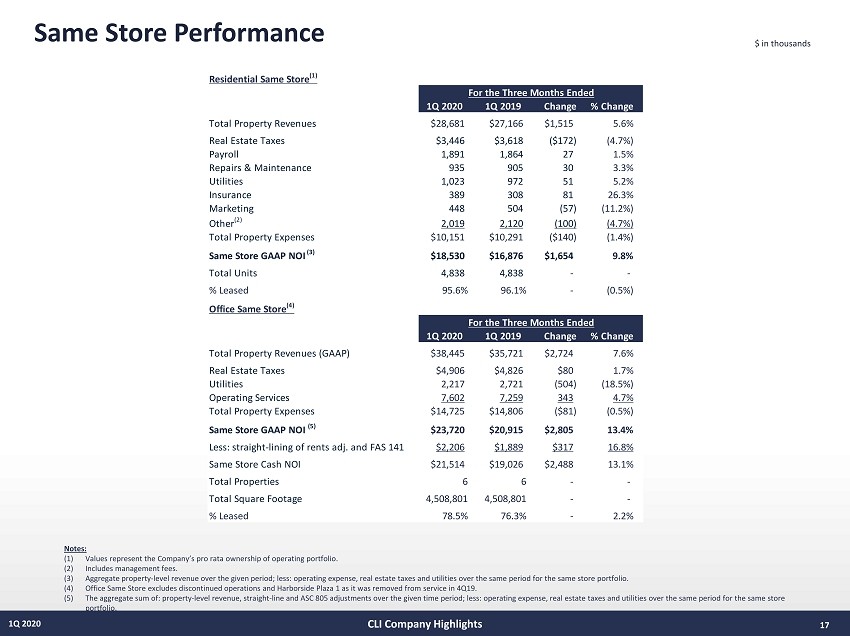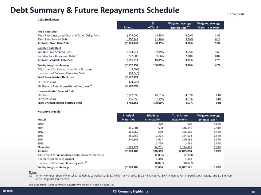 Same Store Performance 17 1Q 2020 $ in thousands Notes: (1) Values represent the Company’s pro rata ownership of operating portfolio. (2) Includes management fees. (3) Aggregate property - level revenue over the given period; less: operating expense, real estate taxes and utilities over the same p eriod for the same store portfolio. (4) Office Same Store excludes discontinued operations and Harborside Plaza 1 as it was removed from service in 4Q19. (5) The aggregate sum of: property - level revenue, straight - line and ASC 805 adjustments over the given time period; less: operating expense, real estate taxes and utilities over the same period for the same store portfolio. CLI Company Highlights Residential Same Store (1) 1Q 2020 1Q 2019 Change % Change Total Property Revenues $28,681 $27,166 $1,515 5.6% Real Estate Taxes $3,446 $3,618 ($172) (4.7%) Payroll 1,891 1,864 27 1.5% Repairs & Maintenance 935 905 30 3.3% Utilities 1,023 972 51 5.2% Insurance 389 308 81 26.3% Marketing 448 504 (57) (11.2%) Other (2) 2,019 2,120 (100) (4.7%) Total Property Expenses $10,151 $10,291 ($140) (1.4%) Same Store GAAP NOI (3) $18,530 $16,876 $1,654 9.8% Total Units 4,838 4,838 - - % Leased 95.6% 96.1% - (0.5%) Office Same Store (4) 1Q 2020 1Q 2019 Change % Change Total Property Revenues (GAAP) $38,445 $35,721 $2,724 7.6% Real Estate Taxes $4,906 $4,826 $80 1.7% Utilities 2,217 2,721 (504) (18.5%) Operating Services 7,602 7,259 343 4.7% Total Property Expenses $14,725 $14,806 ($81) (0.5%) Same Store GAAP NOI (5) $23,720 $20,915 $2,805 13.4% Less: straight-lining of rents adj. and FAS 141 $2,206 $1,889 $317 16.8% Same Store Cash NOI $21,514 $19,026 $2,488 13.1% Total Properties 6 6 - - Total Square Footage 4,508,801 4,508,801 - - % Leased 78.5% 76.3% - 2.2% For the Three Months Ended For the Three Months Ended