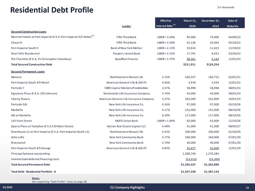 19 1Q 2020 Residential Debt Profile Notes: See supporting “Debt Profile” notes on page 38. $ in thousands CLI Company Highlights Effective March 31, December 31, Date of Lender Interest Rate (1) 2020 2019 Maturity Secured Construction Loans Marriott Hotels at Port Imperial (F.K.A. Port Imperial 4/5 Hotel) (5) Fifth Third Bank LIBOR + 3.40% 94,000 74,000 04/09/22 Chase III Fifth Third Bank LIBOR + 2.50% 42,136 24,064 05/16/22 Port Imperial South 9 Bank of New York Mellon LIBOR + 2.13% 19,624 11,615 12/19/22 Short Hills Residential People's United Bank LIBOR + 2.15% 17,791 9,431 03/26/23 The Charlotte (F.K.A. 25 Christopher Columbus) QuadReal Finance LIBOR + 2.75% 38,361 5,144 12/01/24 Total Secured Construction Debt $211,911 $124,254 Secured Permanent Loans Monaco Northwestern Mutual Life 3.15% 166,347 166,752 02/01/21 Port Imperial South 4/5 Retail American General Life & A/G PC 4.56% 3,918 3,934 12/01/21 Portside 7 CBRE Capital Markets/FreddieMac 3.57% 58,998 58,998 08/01/23 Signature Place (F.K.A. 250 Johnson) Nationwide Life Insurance Company 3.74% 43,000 43,000 08/01/24 Liberty Towers American General Life Insurance Company 3.37% 265,000 232,000 10/01/24 Portside 5/6 New York Life Insurance Co. 4.56% 97,000 97,000 03/10/26 Marbella New York Life Insurance Co. 4.17% 131,000 131,000 08/10/26 M2 at Marbella New York Life Insurance Co. 4.29% 117,000 117,000 08/10/26 145 Front Street MUFG Union Bank LIBOR + 1.84% 63,000 63,000 12/10/26 Quarry Place at Tuckahoe (F.K.A 150 Main Street) Natixis Real Estate Capital LLC 4.48% 41,000 41,000 08/05/27 RiverHouse 11 at Port Imperial (F.K.A. Port Imperial South 11) Northwestern Mutual Life 4.52% 100,000 100,000 01/10/29 Soho Lofts New York Community Bank 3.77% 160,000 160,000 07/01/29 Riverwatch New York Community Bank 3.79% 30,000 30,000 07/01/29 Port Imperial South 4/5 Garage American General Life & A/G PC 4.85% 32,477 32,600 12/01/29 Principal balance outstanding 1,308,740 1,276,284 Unamortized deferred financing costs (13,313) (13,394) Total Secured Permanent Debt $1,295,427 $1,262,890 Total Debt - Residential Portfolio - A $1,507,338 $1,387,144