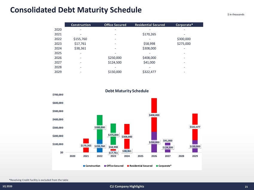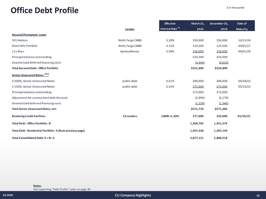 20 1Q 2020 Office Debt Profile Notes: See supporting “Debt Profile” notes on page 38. $ in thousands CLI Company Highlights Effective March 31, December 31, Date of Lender Interest Rate (1) 2020 2019 Maturity Secured Permanent Loans 101 Hudson Wells Fargo CMBS 3.20% 250,000 250,000 10/11/26 Short Hills Portfolio Wells Fargo CMBS 4.15% 124,500 124,500 04/01/27 111 River Apollo/Athene 3.90% 150,000 150,000 09/01/29 Principal balance outstanding 524,500 524,500 Unamortized deferred financing costs (3,494) (3,610) Total Secured Debt - Office Portfolio $521,006 $520,890 Senior Unsecured Notes: (2)(3) 4.500%, Senior Unsecured Notes public debt 4.61% 300,000 300,000 04/18/22 3.150%, Senior Unsecured Notes public debt 3.52% 275,000 275,000 05/15/23 Principal balance outstanding 575,000 575,000 Adjustment for unamortized debt discount (2,004) (2,170) Unamortized deferred financing costs (1,220) (1,346) Total Senior Unsecured Notes, net: $571,776 $571,484 Revolving Credit Facilities 13 Lenders LIBOR +1.30% 277,000 329,000 01/25/21 Total Debt - Office Portfolio - B 1,369,782 1,421,374 Total Debt - Residential Portfolio - A (from previous page) 1,507,338 1,387,144 Total Consolidated Debt: A + B = C 2,877,121 2,808,518