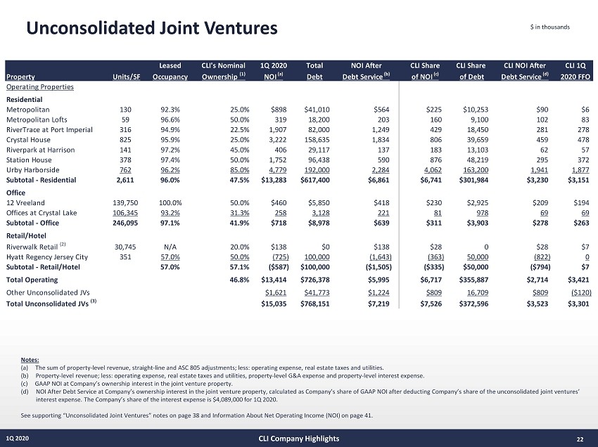 21 1Q 2020 Consolidated Debt Maturity Schedule $ in thousands CLI Company Highlights *Revolving Credit Facility is excluded from the table Construction Office Secured Residential Secured Corporate* 2020 - - - - 2021 - - $170,265 - 2022 $155,760 - - $300,000 2023 $17,761 - $58,998 $275,000 2024 $38,361 - $308,000 - 2025 - - - - 2026 - $250,000 $408,000 - 2027 - $124,500 $41,000 - 2028 - - - - 2029 - $150,000 $322,477 - $155,760 $17,761 $38,361 $250,000 $124,500 $150,000 $170,265 $58,998 $308,000 $408,000 $41,000 $322,477 $300,000 $275,000 $0 $100,000 $200,000 $300,000 $400,000 $500,000 $600,000 $700,000 2020 2021 2022 2023 2024 2025 2026 2027 2028 2029 Debt Maturity Schedule Construction Office Secured Residential Secured Corporate*
