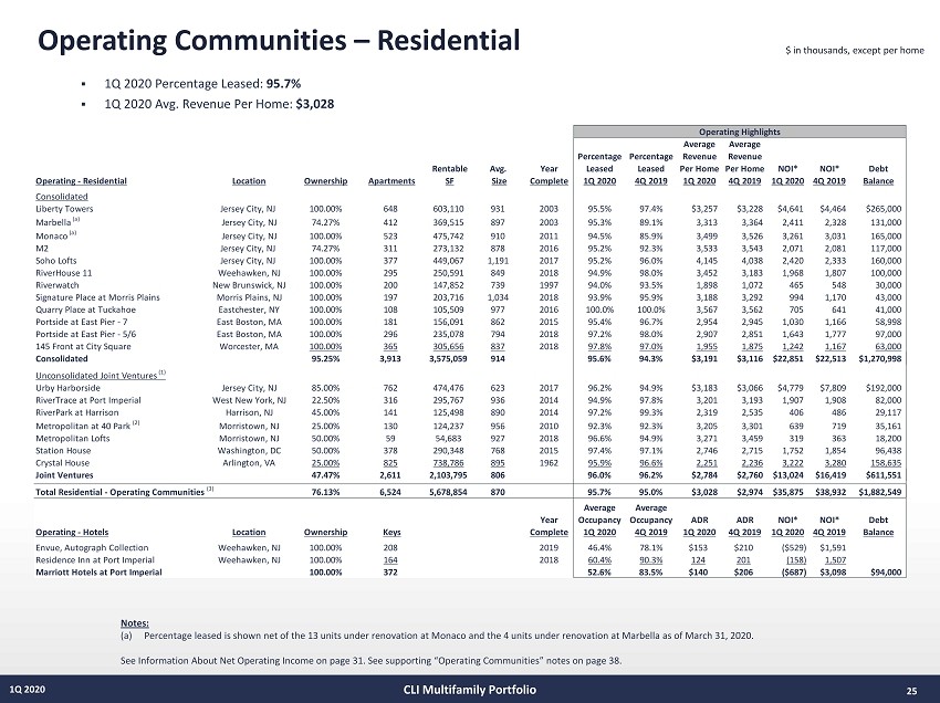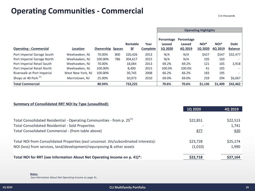 $ in thousands, except per home Operating Communities – Residential 25 1Q 2020 Notes: (a) Percentage leased is shown net of the 13 units under renovation at Monaco and the 4 units under renovation at Marbella as of Mar ch 31, 2020. See Information About Net Operating Income on page 31. See supporting “Operating Communities” notes on page 38. CLI Multifamily Portfolio ▪ 1 Q 2020 Percentage Leased : 95 . 7 % ▪ 1 Q 2020 Avg . Revenue Per Home : $ 3 , 028 Average Average Percentage Percentage Revenue Revenue Rentable Avg. Year Leased Leased Per Home Per Home NOI* NOI* Debt Operating - Residential Location Ownership Apartments SF Size Complete 1Q 2020 4Q 2019 1Q 2020 4Q 2019 1Q 2020 4Q 2019 Balance Consolidated Liberty Towers Jersey City, NJ 100.00% 648 603,110 931 2003 95.5% 97.4% $3,257 $3,228 $4,641 $4,464 $265,000 Marbella (a) Jersey City, NJ 74.27% 412 369,515 897 2003 95.3% 89.1% 3,313 3,364 2,411 2,328 131,000 Monaco (a) Jersey City, NJ 100.00% 523 475,742 910 2011 94.5% 85.9% 3,499 3,526 3,261 3,031 165,000 M2 Jersey City, NJ 74.27% 311 273,132 878 2016 95.2% 92.3% 3,533 3,543 2,071 2,081 117,000 Soho Lofts Jersey City, NJ 100.00% 377 449,067 1,191 2017 95.2% 96.0% 4,145 4,038 2,420 2,333 160,000 RiverHouse 11 Weehawken, NJ 100.00% 295 250,591 849 2018 94.9% 98.0% 3,452 3,183 1,968 1,807 100,000 Riverwatch New Brunswick, NJ 100.00% 200 147,852 739 1997 94.0% 93.5% 1,898 1,072 465 548 30,000 Signature Place at Morris Plains Morris Plains, NJ 100.00% 197 203,716 1,034 2018 93.9% 95.9% 3,188 3,292 994 1,170 43,000 Quarry Place at Tuckahoe Eastchester, NY 100.00% 108 105,509 977 2016 100.0% 100.0% 3,567 3,562 705 641 41,000 Portside at East Pier - 7 East Boston, MA 100.00% 181 156,091 862 2015 95.4% 96.7% 2,954 2,945 1,030 1,166 58,998 Portside at East Pier - 5/6 East Boston, MA 100.00% 296 235,078 794 2018 97.2% 98.0% 2,907 2,851 1,643 1,777 97,000 145 Front at City Square Worcester, MA 100.00% 365 305,656 837 2018 97.8% 97.0% 1,955 1,875 1,242 1,167 63,000 Consolidated 95.25% 3,913 3,575,059 914 95.6% 94.3% $3,191 $3,116 $22,851 $22,513 $1,270,998 Unconsolidated Joint Ventures (1) Urby Harborside Jersey City, NJ 85.00% 762 474,476 623 2017 96.2% 94.9% $3,183 $3,066 $4,779 $7,809 $192,000 RiverTrace at Port Imperial West New York, NJ 22.50% 316 295,767 936 2014 94.9% 97.8% 3,201 3,193 1,907 1,908 82,000 RiverPark at Harrison Harrison, NJ 45.00% 141 125,498 890 2014 97.2% 99.3% 2,319 2,535 406 486 29,117 Metropolitan at 40 Park (2) Morristown, NJ 25.00% 130 124,237 956 2010 92.3% 92.3% 3,205 3,301 639 719 35,161 Metropolitan Lofts Morristown, NJ 50.00% 59 54,683 927 2018 96.6% 94.9% 3,271 3,459 319 363 18,200 Station House Washington, DC 50.00% 378 290,348 768 2015 97.4% 97.1% 2,746 2,715 1,752 1,854 96,438 Crystal House Arlington, VA 25.00% 825 738,786 895 1962 95.9% 96.6% 2,251 2,236 3,222 3,280 158,635 Joint Ventures 47.47% 2,611 2,103,795 806 96.0% 96.2% $2,784 $2,760 $13,024 $16,419 $611,551 Total Residential - Operating Communities (3) 76.13% 6,524 5,678,854 870 95.7% 95.0% $3,028 $2,974 $35,875 $38,932 $1,882,549 Average Average Year Occupancy Occupancy ADR ADR NOI* NOI* Debt Operating - Hotels Location Ownership Keys Complete 1Q 2020 4Q 2019 1Q 2020 4Q 2019 1Q 2020 4Q 2019 Balance Envue, Autograph Collection Weehawken, NJ 100.00% 208 2019 46.4% 78.1% $153 $210 ($529) $1,591 Residence Inn at Port Imperial Weehawken, NJ 100.00% 164 2018 60.4% 90.3% 124 201 (158) 1,507 Marriott Hotels at Port Imperial 100.00% 372 52.6% 83.5% $140 $206 ($687) $3,098 $94,000 Operating Highlights