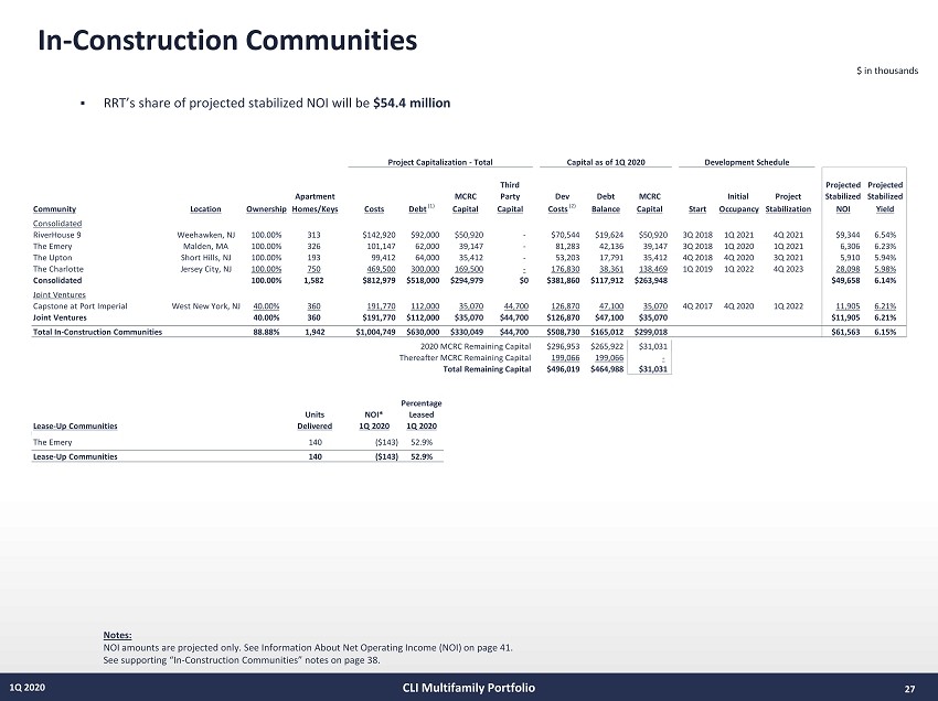 Operating Communities - Commercial 1Q 2020 26 $ in thousands CLI Multifamily Portfolio Notes: See Information About Net Operating Income on page 41. Percentage Percentage Rentable Year Leased Leased NOI* NOI* Debt Operating - Commercial Location Ownership Spaces SF Complete 1Q 2020 4Q 2019 1Q 2020 4Q 2019 Balance Port Imperial Garage South Weehawken, NJ 70.00% 800 320,426 2013 N/A N/A $427 $547 $32,477 Port Imperial Garage North Weehawken, NJ 100.00% 786 304,617 2015 N/A N/A 105 163 - Port Imperial Retail South Weehawken, NJ 70.00% 18,064 2013 69.2% 69.2% 121 105 3,918 Port Imperial Retail North Weehawken, NJ 100.00% 8,400 2015 100.0% 100.0% 41 105 - Riverwalk at Port Imperial West New York, NJ 100.00% 30,745 2008 66.2% 66.2% 183 195 - Shops at 40 Park (1) Morristown, NJ 25.00% 50,973 2010 69.0% 69.0% 259 294 $6,067 Total Commercial 80.94% 733,225 70.6% 70.6% $1,136 $1,409 $42,462 Operating Highlights Summary of Consolidated RRT NOI by Type (unaudited): 1Q 2020 4Q 2019 Total Consolidated Residential - Operating Communities - from p. 25 (1) $22,851 $22,513 Total Consolidated Residential - Sold Properties - 1,741 Total Consolidated Commercial - (from table above) 877 920 Total NOI from Consolidated Properties (excl unconsol. JVs/subordinated interests): $23,728 $25,174 NOI (loss) from services, land/development/repurposing & other assets (1,010) 1,990 Total NOI for RRT (see Information About Net Operating Income on p. 41)*: $22,718 $27,164