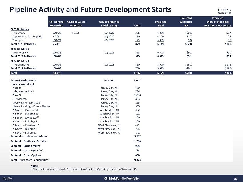 In - Construction Communities 27 1Q 2020 ▪ RRT’s share of projected stabilized NOI will be $ 54 . 4 million $ in thousands Notes: NOI amounts are projected only. See Information About Net Operating Income (NOI) on page 41. See supporting “In - Construction Communities” notes on page 38. CLI Multifamily Portfolio Third Projected Projected Apartment MCRC Party Dev Debt MCRC Initial Project Stabilized Stabilized Community Location Ownership Homes/Keys Costs Debt (1) Capital Capital Costs (2) Balance Capital Start Occupancy Stabilization NOI Yield Consolidated RiverHouse 9 Weehawken, NJ 100.00% 313 $142,920 $92,000 $50,920 - $70,544 $19,624 $50,920 3Q 2018 1Q 2021 4Q 2021 $9,344 6.54% The Emery Malden, MA 100.00% 326 101,147 62,000 39,147 - 81,283 42,136 39,147 3Q 2018 1Q 2020 1Q 2021 6,306 6.23% The Upton Short Hills, NJ 100.00% 193 99,412 64,000 35,412 - 53,203 17,791 35,412 4Q 2018 4Q 2020 3Q 2021 5,910 5.94% The Charlotte Jersey City, NJ 100.00% 750 469,500 300,000 169,500 - 176,830 38,361 138,469 1Q 2019 1Q 2022 4Q 2023 28,098 5.98% Consolidated 100.00% 1,582 $812,979 $518,000 $294,979 $0 $381,860 $117,912 $263,948 $49,658 6.14% Joint Ventures Capstone at Port Imperial West New York, NJ 40.00% 360 191,770 112,000 35,070 44,700 126,870 47,100 35,070 4Q 2017 4Q 2020 1Q 2022 11,905 6.21% Joint Ventures 40.00% 360 $191,770 $112,000 $35,070 $44,700 $126,870 $47,100 $35,070 $11,905 6.21% Total In-Construction Communities 88.88% 1,942 $1,004,749 $630,000 $330,049 $44,700 $508,730 $165,012 $299,018 $61,563 6.15% 2020 MCRC Remaining Capital $296,953 $265,922 $31,031 Thereafter MCRC Remaining Capital 199,066 199,066 - Total Remaining Capital $496,019 $464,988 $31,031 Percentage Units NOI* Leased Lease-Up Communities Delivered 1Q 2020 1Q 2020 The Emery 140 ($143) 52.9% Lease-Up Communities 140 ($143) 52.9% Project Capitalization - Total Capital as of 1Q 2020 Development Schedule