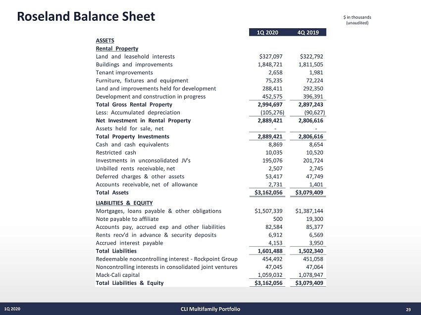 Roseland Balance Sheet 29 1Q 2020 $ in thousands (unaudited) CLI Multifamily Portfolio 1Q 2020 4Q 2019 ASSETS Rental Property Land and leasehold interests $327,097 $322,792 Buildings and improvements 1,848,721 1,811,505 Tenant improvements 2,658 1,981 Furniture, fixtures and equipment 75,235 72,224 Land and improvements held for development 288,411 292,350 Development and construction in progress 452,575 396,391 Total Gross Rental Property 2,994,697 2,897,243 Less: Accumulated depreciation (105,276) (90,627) Net Investment in Rental Property 2,889,421 2,806,616 Assets held for sale, net - - Total Property Investments 2,889,421 2,806,616 Cash and cash equivalents 8,869 8,654 Restricted cash 10,035 10,520 Investments in unconsolidated JV's 195,076 201,724 Unbilled rents receivable, net 2,507 2,745 Deferred charges & other assets 53,417 47,749 Accounts receivable, net of allowance 2,731 1,401 Total Assets $3,162,056 $3,079,409 LIABILITIES & EQUITY Mortgages, loans payable & other obligations $1,507,339 $1,387,144 Note payable to affiliate 500 19,300 Accounts pay, accrued exp and other liabilities 82,584 85,377 Rents recv'd in advance & security deposits 6,912 6,569 Accrued interest payable 4,153 3,950 Total Liabilities 1,601,488 1,502,340 Redeemable noncontrolling interest - Rockpoint Group 454,492 451,058 Noncontrolling interests in consolidated joint ventures 47,045 47,064 Mack-Cali capital 1,059,032 1,078,947 Total Liabilities & Equity $3,162,056 $3,079,409