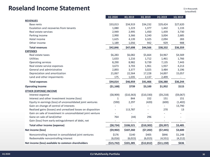 Roseland Income Statement 30 1Q 2020 $ in thousands (unaudited) CLI Multifamily Portfolio 1Q 2020 4Q 2019 3Q 2019 2Q 2019 1Q 2019 REVENUES Base rents $33,013 $34,919 $34,232 $29,424 $27,620 Escalation and recoveries from tenants 1,080 1,223 1,377 1,442 1,133 Real estate services 2,949 2,995 1,450 1,439 3,730 Parking income 2,990 3,366 3,240 3,004 2,685 Hotel income 1,625 4,139 3,325 2,094 283 Other income 1,189 1,056 942 929 908 Total revenues $42,846 $47,698 $44,566 $38,332 $36,359 EXPENSES Real estate taxes $6,283 $6,082 $5,664 $4,967 $4,569 Utilities 1,633 1,216 1,712 1,461 1,766 Operating services 8,290 8,982 9,739 7,135 7,443 Real estate service expenses 3,673 3,703 1,961 1,937 4,213 General and administrative 2,893 3,377 3,025 3,484 3,196 Depreciation and amortization 21,067 22,564 17,228 14,897 15,057 Land and other impairments 175 1,035 2,137 2,499 - Total expenses $44,014 $46,959 $41,466 $36,380 $36,244 Operating Income ($1,168) $739 $3,100 $1,952 $115 OTHER (EXPENSE) INCOME Interest expense ($8,909) ($10,363) ($10,330) ($9,218) ($9,067) Interest and other investment income (loss) 1 844 152 151 151 Equity in earnings (loss) of unconsolidated joint ventures (590) 2,297 (420) (600) (1,402) Gain on change of control of interests - - - - 13,790 Realized gains (losses) and unrealized losses on disposition - 113,787 - 270 13 Gain on sale of investment in unconsolidated joint venture - - - - - Gane on sale of land/other 764 (44) 296 - - Gain (loss) from early extinguishment of debt, net - - - - - Total other income (expense) ($8,734) $106,521 ($10,302) ($9,397) $3,485 Net income (loss) ($9,902) $107,260 ($7,202) ($7,445) $3,600 Noncontrolling interest in consolidated joint ventures $176 $140 $405 $846 $1,248 Redeemable noncontrolling interest (6,016) (6,015) (6,015) (4,551) (4,212) Net income (loss) available to common shareholders ($15,742) $101,385 ($12,812) ($11,150) $636