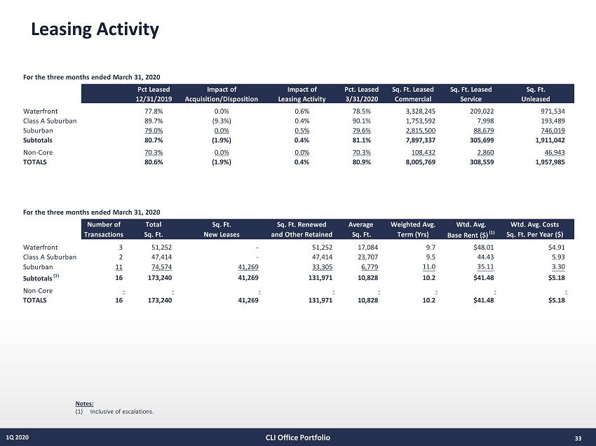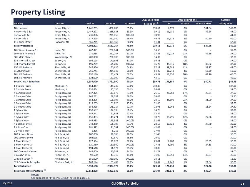 Property Listing 32 1Q 2020 CLI Office Portfolio Notes: See supporting “Property Listing” notes on page 39. Avg. Base Rent Current Building Location Total SF Leased SF % Leased + Escalations (1) SF % Total In-Place Rent Asking Rent 101 Hudson Jersey City, NJ 1,246,283 1,062,285 85.2% $38.62 4,170 0% $41.64 $47.00 Harborside 2 & 3 Jersey City, NJ 1,487,222 1,238,621 83.3% 39.16 16,130 1% 32.58 43.00 Harborside 4a Jersey City, NJ 231,856 231,856 100.0% 38.93 - 0% - 44.00 Harborside 5 Jersey City, NJ 977,225 551,340 56.4% 40.73 17,678 2% 40.50 49.00 111 River Street Hoboken, NJ 566,215 453,165 80.0% 41.31 - 0% - 52.00 Total Waterfront 4,508,801 3,537,267 78.5% $39.51 37,978 1% $37.26 $46.59 101 Wood Avenue S Iselin, NJ 262,841 262,841 100.0% 34.56 - 0% - 37.00 99 Wood Avenue S Iselin, NJ 271,988 222,287 81.7% 37.23 62,029 23% 42.36 37.00 581 Main Street Woodbridge, NJ 200,000 200,000 100.0% 34.32 - 0% - 32.00 333 Thornall Street Edison, NJ 196,128 170,698 87.0% 36.38 - 0% - 37.00 343 Thornall Street Edison, NJ 195,709 195,709 100.0% 36.25 35,345 18% 32.82 37.00 150 JFK Parkway Short Hills, NJ 247,476 160,636 64.9% 37.29 29,288 12% 38.87 48.00 51 JFK Parkway Short Hills, NJ 260,741 234,942 90.1% 54.39 11,242 4% 55.39 55.00 101 JFK Parkway Short Hills, NJ 197,196 191,477 97.1% 43.97 18,950 10% 44.16 45.00 103 JFK Parkway Short Hills, NJ 123,000 123,000 100.0% 43.10 - 0% - 45.00 Total Class A Suburban 1,955,079 1,761,590 90.1% $39.73 156,854 8% $40.71 $41.59 1 Giralda Farms Madison, NJ 154,417 149,745 97.0% $40.47 - 0% - $37.00 7 Giralda Farms Madison, NJ 236,674 142,136 60.1% 36.48 - 0% - 37.00 4 Campus Drive Parsippany, NJ 147,475 113,678 77.1% 25.50 25,768 17% 22.84 27.50 6 Campus Drive Parsippany, NJ 148,291 98,594 66.5% 26.68 - 0% - 27.50 7 Campus Drive Parsippany, NJ 154,395 106,908 69.2% 28.10 35,696 23% 31.00 27.50 8 Campus Drive Parsippany, NJ 215,265 161,826 75.2% 31.65 - 0% - 33.00 9 Campus Drive Parsippany, NJ 156,495 145,114 92.7% 22.91 5,261 3% 18.24 27.50 1 Sylvan Way Parsippany, NJ 150,557 122,938 81.7% 34.20 - 0% - 33.00 3 Sylvan Way Parsippany, NJ 147,241 91,851 62.4% 32.26 - 0% - 33.00 5 Sylvan Way Parsippany, NJ 151,383 149,271 98.6% 30.76 18,796 12% 27.66 33.00 7 Sylvan Way Parsippany, NJ 145,983 145,983 100.0% 31.42 - 0% - 33.00 4 Gatehall Drive Parsippany, NJ 248,480 158,306 63.7% 28.56 10,528 4% 26.80 30.00 2 Hilton Court Parsippany, NJ 181,592 181,592 100.0% 42.64 - 0% - 32.00 2 Dryden Way Parsippany, NJ 6,216 6,216 100.0% 17.94 - 0% - 16.50 100 Schultz Drive Red Bank, NJ 100,000 28,506 28.5% 31.48 - 0% - 30.00 200 Schultz Drive Red Bank, NJ 102,018 87,579 85.8% 29.69 - 0% - 30.00 1 River Center 1 Red Bank, NJ 122,594 119,622 97.6% 29.01 7,707 6% 26.85 30.00 1 River Center 2 Red Bank, NJ 120,360 120,360 100.0% 27.31 6,790 6% 27.53 30.00 1 River Center 3 Red Bank, NJ 194,518 76,572 39.4% 30.06 - 0% - 30.00 100 Overlook Center Princeton, NJ 149,600 140,583 94.0% 31.71 - 0% - 32.00 5 Vaughn Drive Princeton, NJ 98,500 43,310 44.0% 31.09 13,953 14% 30.57 30.00 23 Main Street (2) Holmdel, NJ 350,000 350,000 100.0% 18.11 - 0% - 18.50 325 Columbia Turnpike Florham Park, NJ 168,144 163,489 97.2% 26.87 2,240 1% 24.04 30.00 Total Suburban 3,650,198 2,904,179 79.6% $29.57 126,739 3% $27.36 $30.06 Total Core Office Portfolio (3) 10,114,078 8,203,036 81.1% $36.04 321,571 3% $35.04 $39.66 2020 Expirations