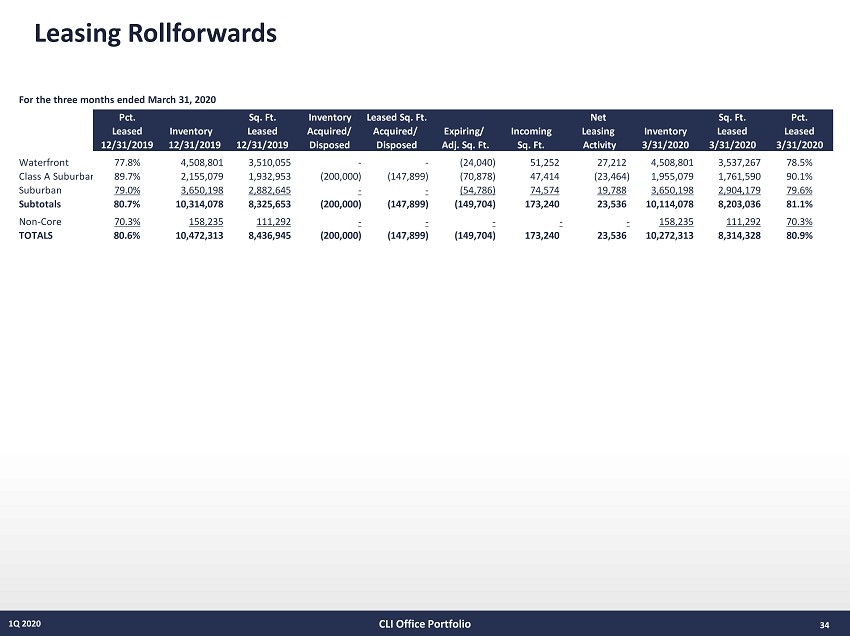Leasing Activity 33 1Q 2020 Notes: (1) Inclusive of escalations. CLI Office Portfolio For the three months ended March 31, 2020 Number of Total Sq. Ft. Sq. Ft. Renewed Average Weighted Avg. Wtd. Avg. Wtd. Avg. Costs Transactions Sq. Ft. New Leases and Other Retained Sq. Ft. Term (Yrs) Base Rent ($) (1) Sq. Ft. Per Year ($) Waterfront 3 51,252 - 51,252 17,084 9.7 $48.01 $4.91 Class A Suburban 2 47,414 - 47,414 23,707 9.5 44.43 5.93 Suburban 11 74,574 41,269 33,305 6,779 11.0 35.11 3.30 Subtotals (1) 16 173,240 41,269 131,971 10,828 10.2 $41.48 $5.18 Non-Core - - - - - - - - TOTALS 16 173,240 41,269 131,971 10,828 10.2 $41.48 $5.18 For the three months ended March 31, 2020 Pct Leased Impact of Impact of Pct. Leased Sq. Ft. Leased Sq. Ft. Leased Sq. Ft. 12/31/2019 Acquisition/Disposition Leasing Activity 3/31/2020 Commercial Service Unleased Waterfront 77.8% 0.0% 0.6% 78.5% 3,328,245 209,022 971,534 Class A Suburban 89.7% (9.3%) 0.4% 90.1% 1,753,592 7,998 193,489 Suburban 79.0% 0.0% 0.5% 79.6% 2,815,500 88,679 746,019 Subtotals 80.7% (1.9%) 0.4% 81.1% 7,897,337 305,699 1,911,042 Non-Core 70.3% 0.0% 0.0% 70.3% 108,432 2,860 46,943 TOTALS 80.6% (1.9%) 0.4% 80.9% 8,005,769 308,559 1,957,985