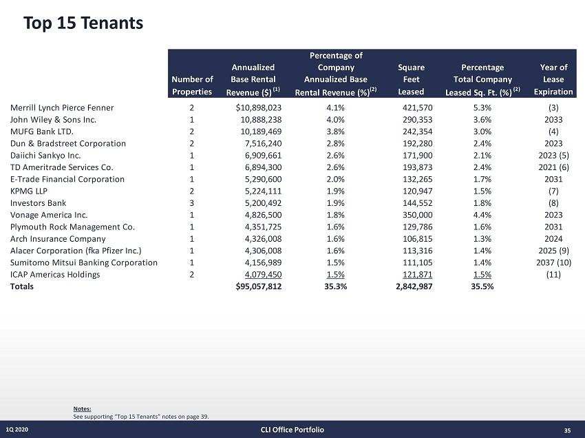 34 1Q 2020 Leasing Rollforwards CLI Office Portfolio For the three months ended March 31, 2020 Pct. Sq. Ft. Inventory Leased Sq. Ft. Net Sq. Ft. Pct. Leased Inventory Leased Acquired/ Acquired/ Expiring/ Incoming Leasing Inventory Leased Leased 12/31/2019 12/31/2019 12/31/2019 Disposed Disposed Adj. Sq. Ft. Sq. Ft. Activity 3/31/2020 3/31/2020 3/31/2020 Waterfront 77.8% 4,508,801 3,510,055 - - (24,040) 51,252 27,212 4,508,801 3,537,267 78.5% Class A Suburban 89.7% 2,155,079 1,932,953 (200,000) (147,899) (70,878) 47,414 (23,464) 1,955,079 1,761,590 90.1% Suburban 79.0% 3,650,198 2,882,645 - - (54,786) 74,574 19,788 3,650,198 2,904,179 79.6% Subtotals 80.7% 10,314,078 8,325,653 (200,000) (147,899) (149,704) 173,240 23,536 10,114,078 8,203,036 81.1% Non-Core 70.3% 158,235 111,292 - - - - - 158,235 111,292 70.3% TOTALS 80.6% 10,472,313 8,436,945 (200,000) (147,899) (149,704) 173,240 23,536 10,272,313 8,314,328 80.9%