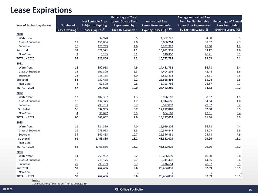 35 1Q 2020 Top 15 Tenants Notes: See supporting “Top 15 Tenants” notes on page 39. CLI Office Portfolio Percentage of Annualized Company Square Percentage Year of Number of Base Rental Annualized Base Feet Total Company Lease Properties Revenue ($) (1) Rental Revenue (%) (2) Leased Leased Sq. Ft. (%) (2) Expiration Merrill Lynch Pierce Fenner 2 $10,898,023 4.1% 421,570 5.3% (3) John Wiley & Sons Inc. 1 10,888,238 4.0% 290,353 3.6% 2033 MUFG Bank LTD. 2 10,189,469 3.8% 242,354 3.0% (4) Dun & Bradstreet Corporation 2 7,516,240 2.8% 192,280 2.4% 2023 Daiichi Sankyo Inc. 1 6,909,661 2.6% 171,900 2.1% 2023 (5) TD Ameritrade Services Co. 1 6,894,300 2.6% 193,873 2.4% 2021 (6) E-Trade Financial Corporation 1 5,290,600 2.0% 132,265 1.7% 2031 KPMG LLP 2 5,224,111 1.9% 120,947 1.5% (7) Investors Bank 3 5,200,492 1.9% 144,552 1.8% (8) Vonage America Inc. 1 4,826,500 1.8% 350,000 4.4% 2023 Plymouth Rock Management Co. 1 4,351,725 1.6% 129,786 1.6% 2031 Arch Insurance Company 1 4,326,008 1.6% 106,815 1.3% 2024 Alacer Corporation (fka Pfizer Inc.) 1 4,306,008 1.6% 113,316 1.4% 2025 (9) Sumitomo Mitsui Banking Corporation 1 4,156,989 1.5% 111,105 1.4% 2037 (10) ICAP Americas Holdings 2 4,079,450 1.5% 121,871 1.5% (11) Totals $95,057,812 35.3% 2,842,987 35.5%