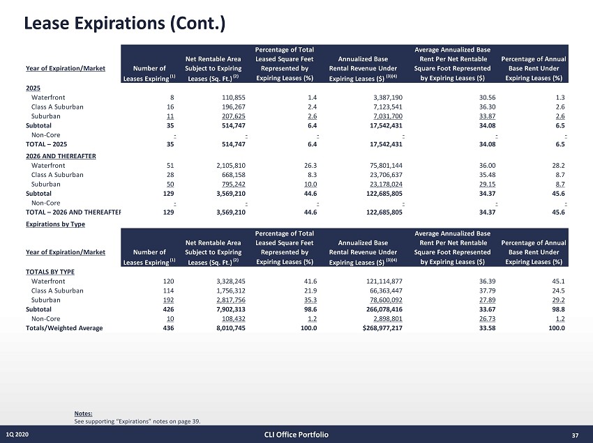 36 1Q 2020 Lease Expirations Notes: See supporting “Expirations” notes on page 39. CLI Office Portfolio Percentage of Total Average Annualized Base Net Rentable Area Leased Square Feet Annualized Base Rent Per Net Rentable Percentage of Annual Year of Expiration/Market Number of Subject to Expiring Represented by Rental Revenue Under Square Foot Represented Base Rent Under Leases Expiring (1) Leases (Sq. Ft.) (2) Expiring Leases (%) Expiring Leases ($) (3)(4) by Expiring Leases ($) Expiring Leases (%) 2020 Waterfront 6 37,978 0.5 1,302,747 34.30 0.5 Class A Suburban 11 156,854 2.0 6,066,264 38.67 2.3 Suburban 16 126,739 1.6 3,282,927 25.90 1.2 Subtotal 33 321,571 4.1 10,651,938 33.12 4.0 Non-Core 2 5,235 0.1 140,850 26.91 0.1 TOTAL – 2020 35 326,806 4.2 10,792,788 33.03 4.1 2021 Waterfront 18 392,953 4.9 14,451,782 36.78 5.4 Class A Suburban 12 101,390 1.3 4,404,398 43.44 1.6 Suburban 23 238,135 3.0 6,812,314 28.61 2.5 Subtotal 53 732,478 9.2 25,668,494 35.04 9.5 Non-Core 4 67,500 0.8 1,793,786 26.57 0.7 TOTAL – 2021 57 799,978 10.0 27,462,280 34.33 10.2 2022 Waterfront 12 102,307 1.3 3,956,110 38.67 1.5 Class A Suburban 15 137,375 1.7 4,744,686 34.54 1.8 Suburban 29 293,283 3.7 8,512,092 29.02 3.2 Subtotal 56 532,965 6.7 17,212,888 32.30 6.5 Non-Core 4 35,697 0.3 964,165 27.01 0.4 TOTAL – 2022 60 568,662 7.0 18,177,053 31.96 6.9 2023 Waterfront 11 324,360 4.0 11,929,205 36.78 4.4 Class A Suburban 16 278,093 3.5 10,576,443 38.03 3.9 Suburban 34 861,433 10.7 21,346,381 24.78 7.9 Subtotal 61 1,463,886 18.2 43,852,029 29.96 16.2 Non-Core - - - - - - TOTAL – 2023 61 1,463,886 18.2 43,852,029 29.96 16.2 2024 Waterfront 14 253,982 3.2 10,286,699 40.50 3.8 Class A Suburban 16 218,175 2.7 9,741,478 44.65 3.6 Suburban 29 295,299 3.7 8,436,654 28.57 3.1 Subtotal 59 767,456 9.6 28,464,831 37.09 10.5 Non-Core - - - - - - TOTAL – 2024 59 767,456 9.6 28,464,831 37.09 10.5