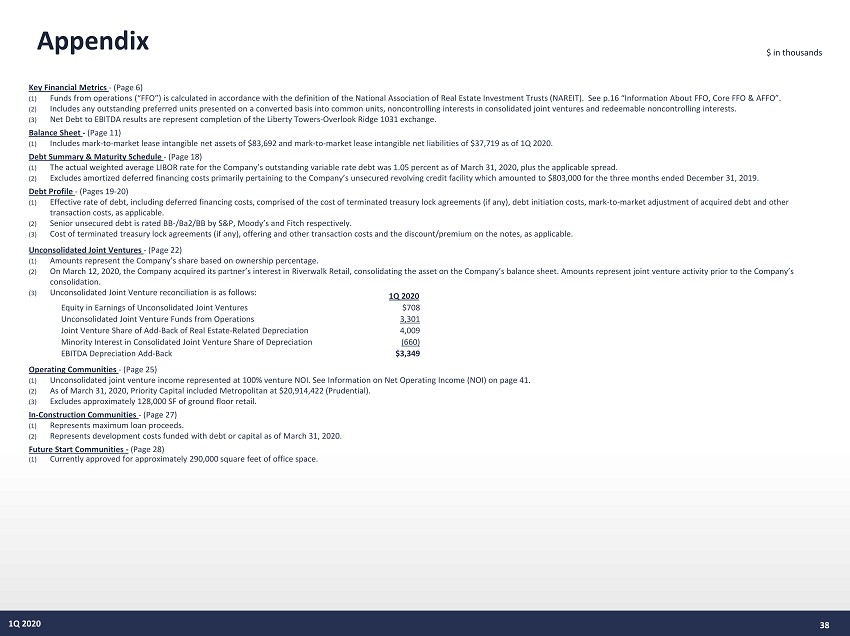 Appendix Key Financial Metrics - (Page 6 ) (1) Funds from operations (“FFO”) is calculated in accordance with the definition of the National Association of Real Estate Investment Trusts (NAREIT) . See p . 16 “Information About FFO, Core FFO & AFFO” . (2) Includes any outstanding preferred units presented on a converted basis into common units, noncontrolling interests in consolidated joint ventures and redeemable noncontrolling interests . (3) Net Debt to EBITDA results are represent completion of the Liberty Towers - Overlook Ridge 1031 exchange . Balance Sheet - (Page 11 ) (1) Includes mark - to - market lease intangible net assets of $ 83 , 692 and mark - to - market lease intangible net liabilities of $ 37 , 719 as of 1 Q 2020 . Debt Summary & Maturity Schedule - (Page 18 ) (1) The actual weighted average LIBOR rate for the Company’s outstanding variable rate debt was 1 . 05 percent as of March 31 , 2020 , plus the applicable spread . (2) Excludes amortized deferred financing costs primarily pertaining to the Company’s unsecured revolving credit facility which amounted to $ 803 , 000 for the three months ended December 31 , 2019 . Debt Profile - (Pages 19 - 20) (1) Effective rate of debt, including deferred financing costs, comprised of the cost of terminated treasury lock agreements (if any ), debt initiation costs, mark - to - market adjustment of acquired debt and other transaction costs, as applicable. (2) Senior unsecured debt is rated BB - /Ba2/BB by S&P, Moody’s and Fitch respectively. (3) Cost of terminated treasury lock agreements (if any), offering and other transaction costs and the discount/premium on the no tes , as applicable. Unconsolidated Joint Ventures - (Page 22) (1) Amounts represent the Company’s share based on ownership percentage. (2) On March 12, 2020, the Company acquired its partner’s interest in Riverwalk Retail, consolidating the asset on the Company’s bal ance sheet. Amounts represent joint venture activity prior to the Company’s consolidation. (3) Unconsolidated Joint Venture reconciliation is as follows: Operating Communities - (Page 25) (1) Unconsolidated joint venture income represented at 100% venture NOI. See Information on Net Operating Income (NOI) on page 41 . (2) As of March 31, 2020, Priority Capital included Metropolitan at $20,914,422 (Prudential). (3) Excludes approximately 128,000 SF of ground floor retail. In - Construction Communities - (Page 27) (1) Represents maximum loan proceeds. (2) Represents development costs funded with debt or capital as of March 31, 2020. Future Start Communities - (Page 28) (1) Currently approved for approximately 290,000 square feet of office space. 38 1Q 2020 1Q 2020 Equity in Earnings of Unconsolidated Joint Ventures $708 Unconsolidated Joint Venture Funds from Operations 3,301 Joint Venture Share of Add - Back of Real Estate - Related Depreciation 4,009 Minority Interest in Consolidated Joint Venture Share of Depreciation (660) EBITDA Depreciation Add - Back $3,349 $ in thousands