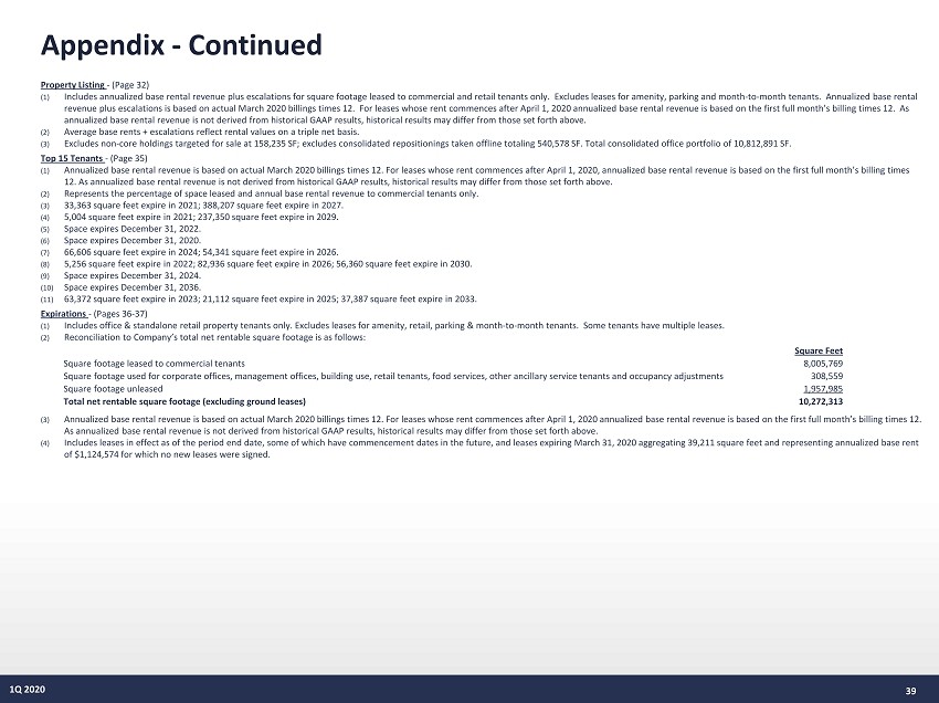 Appendix - Continued Property Listing - (Page 32) (1) Includes annualized base rental revenue plus escalations for square footage leased to commercial and retail tenants only. Ex clu des leases for amenity, parking and month - to - month tenants. Annualized base rental revenue plus escalations is based on actual March 2020 billings times 12. For leases whose rent commences after April 1, 202 0 a nnualized base rental revenue is based on the first full month’s billing times 12. As annualized base rental revenue is not derived from historical GAAP results, historical results may differ from those set fort h a bove. (2) Average base rents + escalations reflect rental values on a triple net basis. (3) Excludes non - core holdings targeted for sale at 158,235 SF; excludes consolidated repositionings taken offline totaling 540,578 SF. Total consolidated office portfolio of 10,812,891 SF. Top 15 Tenants - (Page 35) (1) Annualized base rental revenue is based on actual March 2020 billings times 12. For leases whose rent commences after April 1 , 2 020, annualized base rental revenue is based on the first full month’s billing times 12. As annualized base rental revenue is not derived from historical GAAP results, historical results may differ from those s et forth above. (2) Represents the percentage of space leased and annual base rental revenue to commercial tenants only. (3) 33,363 square feet expire in 2021; 388,207 square feet expire in 2027. (4) 5,004 square feet expire in 2021; 237,350 square feet expire in 2029. (5) Space expires December 31, 2022. (6) Space expires December 31, 2020. (7) 66,606 square feet expire in 2024; 54,341 square feet expire in 2026. (8) 5,256 square feet expire in 2022; 82,936 square feet expire in 2026; 56,360 square feet expire in 2030. (9) Space expires December 31, 2024. (10) Space expires December 31, 2036. (11) 63,372 square feet expire in 2023; 21,112 square feet expire in 2025; 37,387 square feet expire in 2033. Expirations - (Pages 36 - 37) (1) Includes office & standalone retail property tenants only. Excludes leases for amenity, retail, parking & month - to - month tenants . Some tenants have multiple leases. (2) Reconciliation to Company’s total net rentable square footage is as follows: (3) Annualized base rental revenue is based on actual March 2020 billings times 12. For leases whose rent commences after April 1 , 2 020 annualized base rental revenue is based on the first full month’s billing times 12. As annualized base rental revenue is not derived from historical GAAP results, historical results may differ from those set f ort h above. (4) Includes leases in effect as of the period end date, some of which have commencement dates in the future, and leases expiring Ma rch 31, 2020 aggregating 39,211 square feet and representing annualized base rent of $1,124,574 for which no new leases were signed. 39 1Q 2020 Square Feet Square footage leased to commercial tenants 8,005,769 Square footage used for corporate offices, management offices, building use, retail tenants, food services, other ancillary service tenants and occupancy adjustments 308,559 Square footage unleased 1,957,985 Total net rentable square footage (excluding ground leases) 10,272,313