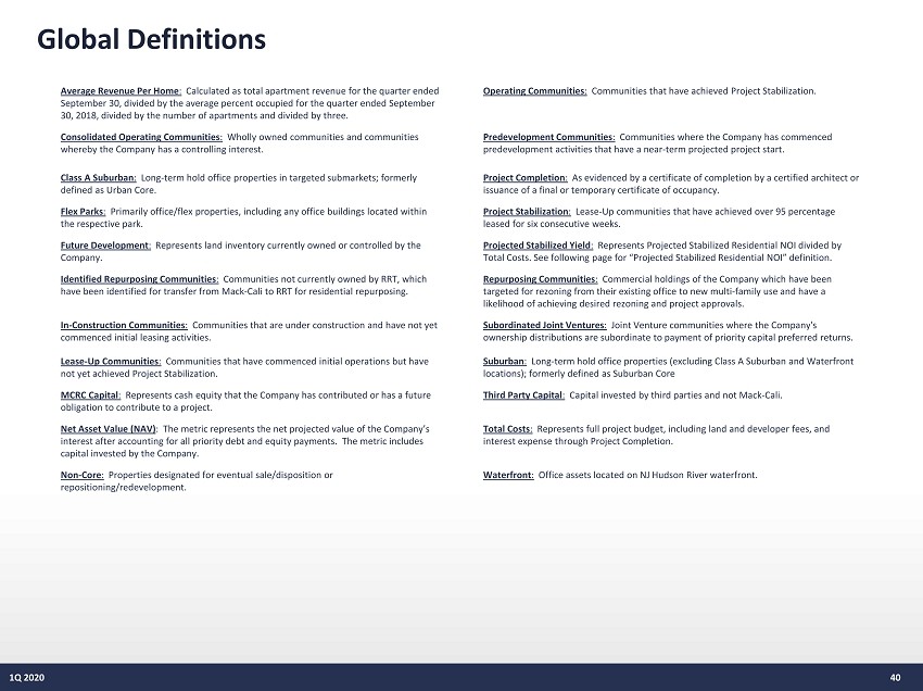 Global Definitions 40 Average Revenue Per Home : Calculated as total apartment revenue for the quarter ended September 30, divided by the average percent occupied for the quarter ended September 30, 2018, divided by the number of apartments and divided by three. Operating Communities : Communities that have achieved Project Stabilization. Consolidated Operating Communities : Wholly owned communities and communities whereby the Company has a controlling interest. Predevelopment Communities : Communities where the Company has commenced predevelopment activities that have a near - term projected project start. Class A Suburban : Long - term hold office properties in targeted submarkets; formerly defined as Urban Core. Project Completion : As evidenced by a certificate of completion by a certified architect or issuance of a final or temporary certificate of occupancy. Flex Parks : Primarily office/flex properties, including any office buildings located within the respective park. Project Stabilization : Lease - Up communities that have achieved over 95 percentage leased for six consecutive weeks. Future Development : Represents land inventory currently owned or controlled by the Company. Projected Stabilized Yield : Represents Projected Stabilized Residential NOI divided by Total Costs. See following page for “Projected Stabilized Residential NOI” definition. Identified Repurposing Communities : Communities not currently owned by RRT, which have been identified for transfer from Mack - Cali to RRT for residential repurposing. Repurposing Communities : Commercial holdings of the Company which have been targeted for rezoning from their existing office to new multi - family use and have a likelihood of achieving desired rezoning and project approvals. In - Construction Communities : Communities that are under construction and have not yet commenced initial leasing activities. Subordinated Joint Ventures : Joint Venture communities where the Company's ownership distributions are subordinate to payment of priority capital preferred returns. Lease - Up Communities : Communities that have commenced initial operations but have not yet achieved Project Stabilization. Suburban : Long - term hold office properties (excluding Class A Suburban and Waterfront locations); formerly defined as Suburban Core MCRC Capital : Represents cash equity that the Company has contributed or has a future obligation to contribute to a project. Third Party Capital : Capital invested by third parties and not Mack - Cali . Net Asset Value (NAV) : The metric represents the net projected value of the Company’s interest after accounting for all priority debt and equity payments. The metric includes capital invested by the Company. Total Costs : Represents full project budget, including land and developer fees, and interest expense through Project Completion. Non - Core : Properties designated for eventual sale/disposition or repositioning/redevelopment. Waterfront : Office assets located on NJ Hudson River waterfront. 1Q 2020