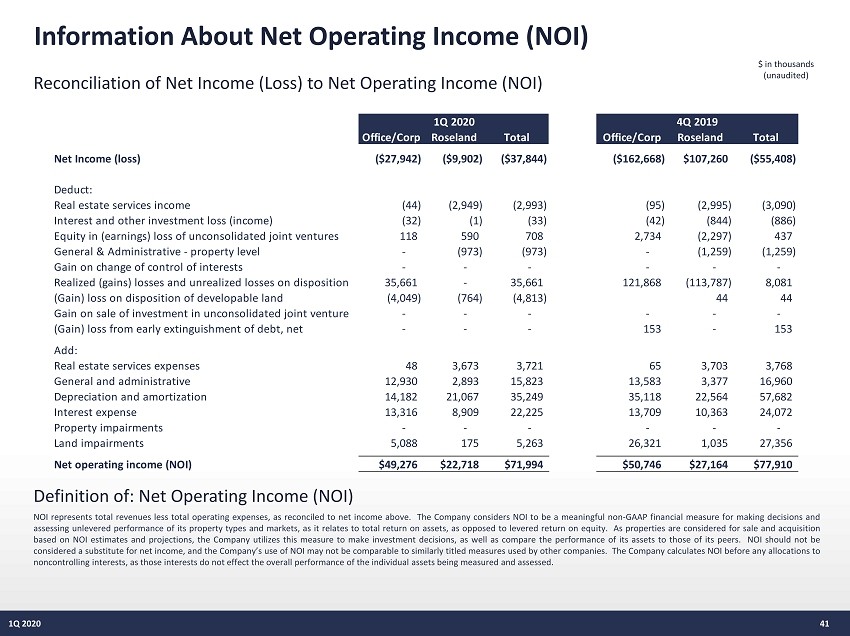 Information About Net Operating Income (NOI) 41 1Q 2020 NOI represents total revenues less total operating expenses, as reconciled to net income above . The Company considers NOI to be a meaningful non - GAAP financial measure for making decisions and assessing unlevered performance of its property types and markets, as it relates to total return on assets, as opposed to levered return on equity . As properties are considered for sale and acquisition based on NOI estimates and projections, the Company utilizes this measure to make investment decisions, as well as compare the performance of its assets to those of its peers . NOI should not be considered a substitute for net income, and the Company’s use of NOI may not be comparable to similarly titled measures used by other companies . The Company calculates NOI before any allocations to noncontrolling interests, as those interests do not effect the overall performance of the individual assets being measured and assessed . Definition of: Net Operating Income (NOI) Reconciliation of Net Income (Loss) to Net Operating Income (NOI) $ in thousands (unaudited) Office/Corp Roseland Total Office/Corp Roseland Total Net Income (loss) ($27,942) ($9,902) ($37,844) ($162,668) $107,260 ($55,408) Deduct: Real estate services income (44) (2,949) (2,993) (95) (2,995) (3,090) Interest and other investment loss (income) (32) (1) (33) (42) (844) (886) Equity in (earnings) loss of unconsolidated joint ventures 118 590 708 2,734 (2,297) 437 General & Administrative - property level - (973) (973) - (1,259) (1,259) Gain on change of control of interests - - - - - - Realized (gains) losses and unrealized losses on disposition 35,661 - 35,661 121,868 (113,787) 8,081 (Gain) loss on disposition of developable land (4,049) (764) (4,813) 44 44 Gain on sale of investment in unconsolidated joint venture - - - - - - (Gain) loss from early extinguishment of debt, net - - - 153 - 153 Add: Real estate services expenses 48 3,673 3,721 65 3,703 3,768 General and administrative 12,930 2,893 15,823 13,583 3,377 16,960 Depreciation and amortization 14,182 21,067 35,249 35,118 22,564 57,682 Interest expense 13,316 8,909 22,225 13,709 10,363 24,072 Property impairments - - - - - - Land impairments 5,088 175 5,263 26,321 1,035 27,356 Net operating income (NOI) $49,276 $22,718 $71,994 $50,746 $27,164 $77,910 1Q 2020 4Q 2019