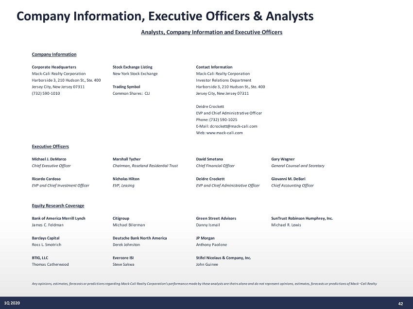 42 1Q 2020 Company Information, Executive Officers & Analysts Company Information Corporate Headquarters Stock Exchange Listing Contact Information Mack-Cali Realty Corporation New York Stock Exchange Mack-Cali Realty Corporation Harborside 3, 210 Hudson St., Ste. 400 Investor Relations Department Jersey City, New Jersey 07311 Trading Symbol Harborside 3, 210 Hudson St., Ste. 400 (732) 590-1010 Common Shares: CLI Jersey City, New Jersey 07311 Deidre Crockett Phone: (732) 590-1025 E-Mail: dcrockett@mack-cali.com Web: www.mack-cali.com Executive Officers Michael J. DeMarco Marshall Tycher David Smetana Gary Wagner Chief Executive Officer Chairman, Roseland Residential Trust Chief Financial Officer General Counsel and Secretary Ricardo Cardoso Nicholas Hilton Deidre Crockett Giovanni M. DeBari EVP and Chief Investment Officer EVP, Leasing EVP and Chief Administrative Officer Chief Accounting Officer Equity Research Coverage Bank of America Merrill Lynch Citigroup Green Street Advisors SunTrust Robinson Humphrey, Inc. James C. Feldman Michael Bilerman Danny Ismail Michael R. Lewis Barclays Capital Deutsche Bank North America JP Morgan Ross L. Smotrich Derek Johnston Anthony Paolone BTIG, LLC Evercore ISI Stifel Nicolaus & Company, Inc. Thomas Catherwood Steve Sakwa John Guinee Analysts, Company Information and Executive Officers Any opinions, estimates, forecasts or predictions regarding Mack-Cali Realty Corporation's performance made by these analysts are theirs alone and do not represent opinions, estimates, forecasts or predictions of Mack-Cali Realty Corporation or its management. Mack-Cali does not by its reference above or distribution imply its endorsement of or concurrence with such opinions, estimates, forecasts or predictions. EVP and Chief Administrative Officer