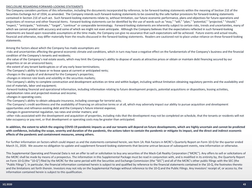 DISCLOSURE REGARDING FORWARD - LOOKING STATEMENTS The Company considers portions of this information, including the documents incorporated by reference, to be forward - looking sta tements within the meaning of Section 21E of the Securities Exchange Act of 1934, as amended. The Company intends such forward - looking statements to be covered by the safe harb or provisions for forward - looking statements contained in Section 21E of such act. Such forward - looking statements relate to, without limitation, our future economic perfor mance, plans and objectives for future operations and projections of revenue and other financial items. Forward - looking statements can be identified by the use of words such as “may ,” “will,” “plan,” “potential,” “projected,” “should,” “expect,” “anticipate,” “estimate,” “target”, “continue” or comparable terminology. Forward - looking statements are inherently s ubject to certain risks, trends and uncertainties, many of which we cannot predict with accuracy and some of which we might not even anticipate. Although the Company believes that the ex pectations reflected in such forward - looking statements are based upon reasonable assumptions at the time made, the Company can give no assurance that such expectations w ill be achieved. Future events and actual results, financial and otherwise, may differ materially from the results discussed in the forward - looking statements. Readers are cautio ned not to place undue reliance on these forward - looking statements. Among the factors about which the Company has made assumptions are: - risks and uncertainties affecting the general economic climate and conditions, which in turn may have a negative effect on th e fundamentals of the Company’s business and the financial condition of the Company’s tenants and residents; - the value of the Company’s real estate assets, which may limit the Company’s ability to dispose of assets at attractive price s or obtain or maintain debt financing secured by our properties or on an unsecured basis; - the extent of any tenant bankruptcies or of any early lease terminations; - The Company’s ability to lease or re - lease space at current or anticipated rents; - changes in the supply of and demand for the Company’s properties; - changes in interest rate levels and volatility in the securities markets; - The Company’s ability to complete construction and development activities on time and within budget, including without limita ti on obtaining regulatory permits and the availability and cost of materials, labor and equipment; - forward - looking financial and operational information, including information relating to future development projects, potential acquisitions or dispositions, leasing activities, capitalization rates and projected revenue and income; - changes in operating costs; - The Company’s ability to obtain adequate insurance, including coverage for terrorist acts; - The Company’s credit worthiness and the availability of financing on attractive terms or at all, which may adversely impact o ur ability to pursue acquisition and development opportunities and refinance existing debt and the Company’s future interest expense; - changes in governmental regulation, tax rates and similar matters; and - other risks associated with the development and acquisition of properties, including risks that the development may not be co mp leted on schedule, that the tenants or residents will not take occupancy or pay rent, or that development or operating costs may be greater than anticipated. In addition, the extent to which the ongoing COVID - 19 pandemic impacts us and our tenants will depend on future developments, wh ich are highly uncertain and cannot be predicted with confidence, including the scope, severity and duration of the pandemic, the actions taken to contain the pandemic or mit iga te its impact, and the direct and indirect economic effects of the pandemic and containment measures, among others. For further information on factors which could impact us and the statements contained herein, see Item 1A: Risk Factors in MC RC’ s Quarterly Report on Form 10 - Q for the quarter ended March 31, 2020. We assume no obligation to update and supplement forward - looking statements that become untrue because of subse quent events, new information or otherwise. This Supplemental Operating and Financial Data is not an offer to sell or solicitation to buy any securities of the Mack - Cali Re ality Corporation (“MCRC”). Any offers to sell or solicitations of the MCRC shall be made by means of a prospectus. The information in this Supplemental Package must be read in conjunction wit h, and is modified in its entirety by, the Quarterly Report on Form 10 - Q (the “10 - Q”) filed by the MCRC for the same period with the Securities and Exchange Commission (the “SEC”) and all of the MCRC’s other public filings with the SEC (the “Public Filings”). In particular, the financial information contained herein is subject to and qualified by reference to the fin ancial statements contained in the 10 - Q, the footnotes thereto and the limitations set forth therein. Investors may not rely on the Supplemental Package without reference to the 10 - Q and the Public Filings. Any investors’ receipt of, or access to, the information contained herein is subject to this qualification. 43 1Q 2020