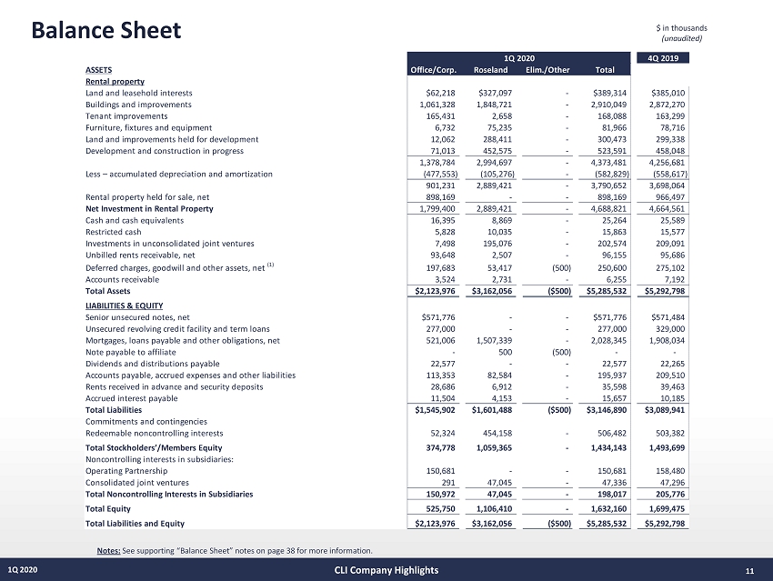 1 1 1Q 2020 Balance Sheet $ in thousands (unaudited) Notes: See supporting “Balance Sheet” notes on page 38 for more information. CLI Company Highlights 4Q 2019 ASSETS Office/Corp. Roseland Elim./Other Total Rental property Land and leasehold interests $62,218 $327,097 - $389,314 $385,010 Buildings and improvements 1,061,328 1,848,721 - 2,910,049 2,872,270 Tenant improvements 165,431 2,658 - 168,088 163,299 Furniture, fixtures and equipment 6,732 75,235 - 81,966 78,716 Land and improvements held for development 12,062 288,411 - 300,473 299,338 Development and construction in progress 71,013 452,575 - 523,591 458,048 1,378,784 2,994,697 - 4,373,481 4,256,681 Less – accumulated depreciation and amortization (477,553) (105,276) - (582,829) (558,617) 901,231 2,889,421 - 3,790,652 3,698,064 Rental property held for sale, net 898,169 - - 898,169 966,497 Net Investment in Rental Property 1,799,400 2,889,421 - 4,688,821 4,664,561 Cash and cash equivalents 16,395 8,869 - 25,264 25,589 Restricted cash 5,828 10,035 - 15,863 15,577 Investments in unconsolidated joint ventures 7,498 195,076 - 202,574 209,091 Unbilled rents receivable, net 93,648 2,507 - 96,155 95,686 Deferred charges, goodwill and other assets, net (1) 197,683 53,417 (500) 250,600 275,102 Accounts receivable 3,524 2,731 - 6,255 7,192 Total Assets $2,123,976 $3,162,056 ($500) $5,285,532 $5,292,798 LIABILITIES & EQUITY Senior unsecured notes, net $571,776 - - $571,776 $571,484 Unsecured revolving credit facility and term loans 277,000 - - 277,000 329,000 Mortgages, loans payable and other obligations, net 521,006 1,507,339 - 2,028,345 1,908,034 Note payable to affiliate - 500 (500) - - Dividends and distributions payable 22,577 - - 22,577 22,265 Accounts payable, accrued expenses and other liabilities 113,353 82,584 - 195,937 209,510 Rents received in advance and security deposits 28,686 6,912 - 35,598 39,463 Accrued interest payable 11,504 4,153 - 15,657 10,185 Total Liabilities $1,545,902 $1,601,488 ($500) $3,146,890 $3,089,941 Commitments and contingencies Redeemable noncontrolling interests 52,324 454,158 - 506,482 503,382 Total Stockholders’/Members Equity 374,778 1,059,365 - 1,434,143 1,493,699 Noncontrolling interests in subsidiaries: Operating Partnership 150,681 - - 150,681 158,480 Consolidated joint ventures 291 47,045 - 47,336 47,296 Total Noncontrolling Interests in Subsidiaries 150,972 47,045 - 198,017 205,776 Total Equity 525,750 1,106,410 - 1,632,160 1,699,475 Total Liabilities and Equity $2,123,976 $3,162,056 ($500) $5,285,532 $5,292,798 1Q 2020