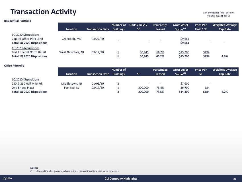 Unconsolidated Joint Ventures 22 1Q 2020 $ in thousands Notes: (a) The sum of property - level revenue, straight - line and ASC 805 adjustments; less: operating expense, real estate taxes and utilities. (b) Property - level revenue; less: operating expense, real estate taxes and utilities, property - level G&A expense and propert y - level interest expense. (c) GAAP NOI at Company’s ownership interest in the joint venture property. (d) NOI After Debt Service at Company’s ownership interest in the joint venture property, calculated as Company’s share of GAAP N OI after deducting Company’s share of the unconsolidated joint ventures’ interest expense. The Company’s share of the interest expense is $4,089,000 for 1Q 2020. See supporting “Unconsolidated Joint Ventures” notes on page 38 and Information About Net Operating Income (NOI) on page 41. CLI Company Highlights Leased CLI's Nominal 1Q 2020 Total NOI After CLI Share CLI Share CLI NOI After CLI 1Q Property Units/SF Occupancy Ownership (1) NOI (a) Debt Debt Service (b) of NOI (c) of Debt Debt Service (d) 2020 FFO Operating Properties Residential Metropolitan 130 92.3% 25.0% $898 $41,010 $564 $225 $10,253 $90 $6 Metropolitan Lofts 59 96.6% 50.0% 319 18,200 203 160 9,100 102 83 RiverTrace at Port Imperial 316 94.9% 22.5% 1,907 82,000 1,249 429 18,450 281 278 Crystal House 825 95.9% 25.0% 3,222 158,635 1,834 806 39,659 459 478 Riverpark at Harrison 141 97.2% 45.0% 406 29,117 137 183 13,103 62 57 Station House 378 97.4% 50.0% 1,752 96,438 590 876 48,219 295 372 Urby Harborside 762 96.2% 85.0% 4,779 192,000 2,284 4,062 163,200 1,941 1,877 Subtotal - Residential 2,611 96.0% 47.5% $13,283 $617,400 $6,861 $6,741 $301,984 $3,230 $3,151 Office 12 Vreeland 139,750 100.0% 50.0% $460 $5,850 $418 $230 $2,925 $209 $194 Offices at Crystal Lake 106,345 93.2% 31.3% 258 3,128 221 81 978 69 69 Subtotal - Office 246,095 97.1% 41.9% $718 $8,978 $639 $311 $3,903 $278 $263 Retail/Hotel Riverwalk Retail (2) 30,745 N/A 20.0% $138 $0 $138 $28 0 $28 $7 Hyatt Regency Jersey City 351 57.0% 50.0% (725) 100,000 (1,643) (363) 50,000 (822) 0 Subtotal - Retail/Hotel 57.0% 57.1% ($587) $100,000 ($1,505) ($335) $50,000 ($794) $7 Total Operating 46.8% $13,414 $726,378 $5,995 $6,717 $355,887 $2,714 $3,421 Other Unconsolidated JVs $1,621 $41,773 $1,224 $809 16,709 $809 ($120) Total Unconsolidated JVs (3) $15,035 $768,151 $7,219 $7,526 $372,596 $3,523 $3,301