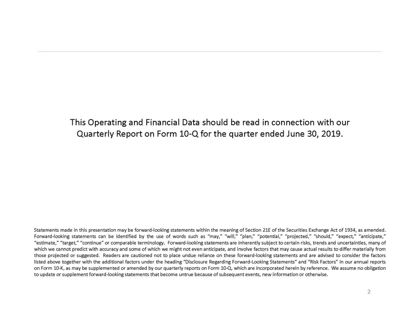 This Operating and Financial Data should be read in connection with our Quarterly Report on Form 10-Q for the quarter ended June 30, 2019. Statements made in this presentation may be forward-looking statements within the meaning of Section 21E of the Securities Exchange Act of 1934, as amended. Forward-looking statements can be identified by the use of words such as “may,” “will,” “plan,” “potential,” “projected,” “should,” “expect,” “anticipate,” “estimate,” “target,” “continue” or comparable terminology. Forward-looking statements are inherently subject to certain risks, trends and uncertainties, many of which we cannot predict with accuracy and some of which we might not even anticipate, and involve factors that may cause actual results to differ materially from those projected or suggested. Readers are cautioned not to place undue reliance on these forward-looking statements and are advised to consider the factors listed above together with the additional factors under the heading “Disclosure Regarding Forward-Looking Statements” and “Risk Factors” in our annual reports on Form 10-K, as may be supplemented or amended by our quarterly reports on Form 10-Q, which are incorporated herein by reference. We assume no obligation to update or supplement forward-looking statements that become untrue because of subsequent events, new information or otherwise. 2