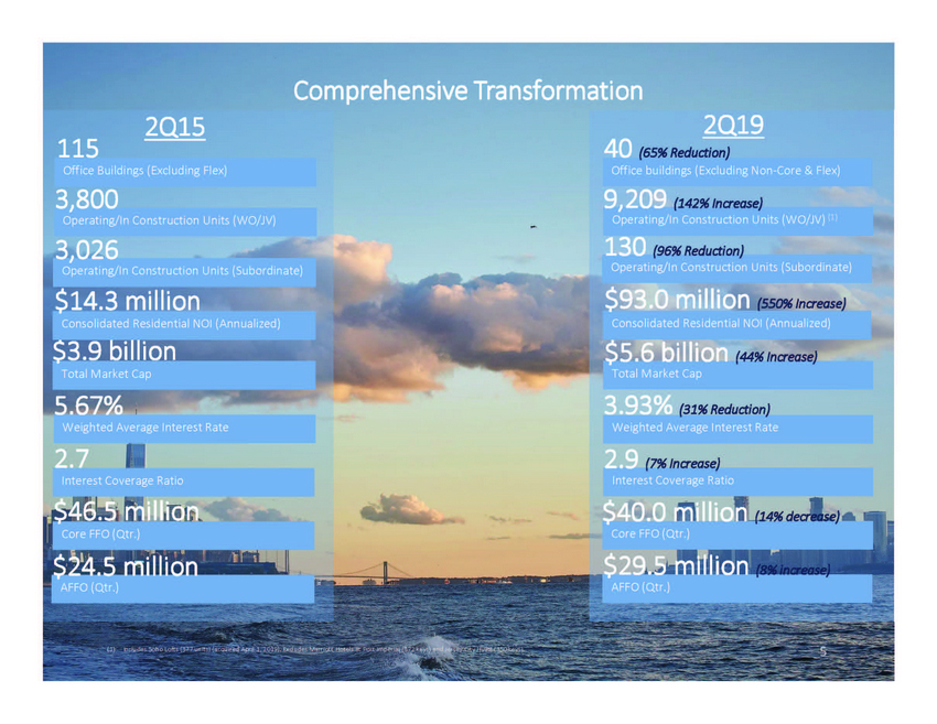 Dual Platforms Form One Strategy: The Waterfront Residential Office $5.6 billion Market Capitalization $3.6 billion Net Asset Value 11.4 million 7,984 97.7% 79.8% 8.7% 17.7% 1,947 6.07% Mack-Cali:$38.92 $45.00 Premium: 16% Market: Mack-Cali:$32.17 $33.00 3% $47.69 Market: Premium: 29% 12% 4 (1) (2) (3) Includes RRT operating portfolio (7,262 units), Marriott Hotels at Port Imperial (372 keys) and Hyatt Jersey City (350 keys). Excludes Marriott Hotels at Port Imperial (372 keys), as Residence Inn (164 keys) opened in December 2018 and Envue Autograph Collection (208 keys) opened in July 2019. Includes Marriott Hotels at Port Imperial (372 units). In-construction avg development yield excluding hotels 6.47%. Office Waterfront Market Share Residential Waterfront Market Share Average Waterfront Rent PSF Suburban Avg Base Rents vs. Market Asking Rent In-Construction Avg Development Yield (3) Waterfront Avg Base Rents vs. Market Asking Rent In-Construction Residential Units/Keys (2) 2Q 2019 Cash/GAAP Rental Rate Roll-Up (Excl. Non-Core) % Leased Residential Units % Leased (Excl. Non-Core) Operating Residential Units/Keys (1) SF Office Space (Incl. Non-Core)