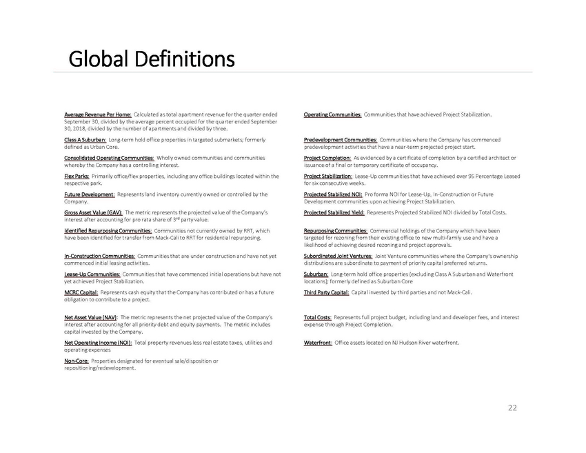 Global Definitions Average Revenue Per Home:Calculated as total apartment revenue for the quarter ended Operating Communities: Communities that have achieved Project Stabilization. September 30, divided by the average percent occupied for the quarter ended September 30, 2018, divided by the number of apartments and divided by three. Class A Suburban:Long-term hold office properties in targeted submarkets; formerly Predevelopment Communities: Communities where the Company has commenced defined as Urban Core. Consolidated Operating Communities: Wholly owned communities and communities predevelopment activities that have a near-term projected project start. Project Completion:As evidenced by a certificate of completion by a certified architect or whereby the Company has a controlling interest. Flex Parks: Primarily office/flex properties, including any office buildings located within the issuance of a final or temporary certificate of occupancy. Project Stabilization: Lease-Up communities that have achieved over 95 Percentage Leased respective park. Future Development:Represents land inventory currently owned or controlled by the for six consecutive weeks. Projected Stabilized NOI: Pro forma NOI for Lease-Up, In-Construction or Future Company. Gross Asset Value (GAV):The metric represents the projected value of the Company’s Development communities upon achieving Project Stabilization. Projected Stabilized Yield:Represents Projected Stabilized NOI divided by Total Costs. interest after accounting for pro rata share of 3rd party value. Identified Repurposing Communities: Communities not currently owned by RRT, which Repurposing Communities: Commercial holdings of the Company which have been have been identified for transfer from Mack-Cali to RRT for residential repurposing. targeted for rezoning from their existing office to new multi-family use and have a likelihood of achieving desired rezoning and project approvals. Subordinated Joint Ventures: Joint Venture communities where the Company's ownership In-Construction Communities: Communities that are under construction and have not yet commenced initial leasing activities. Lease-Up Communities: Communities that have commenced initial operations but have not distributions are subordinate to payment of priority capital preferred returns. Suburban:Long-term hold office properties (excluding Class A Suburban and Waterfront locations); formerly defined as Suburban Core Third Party Capital: Capital invested by third parties and not Mack-Cali. yet achieved Project Stabilization. MCRC Capital:Represents cash equity that the Company has contributed or has a future obligation to contribute to a project. Net Asset Value (NAV): The metric represents the net projected value of the Company’s Total Costs:Represents full project budget, including land and developer fees, and interest interest after accounting for all priority debt and equity payments. The metric includes capital invested by the Company. Net Operating Income (NOI):Total property revenues less real estate taxes, utilities and expense through Project Completion. Waterfront: Office assets located on NJ Hudson River waterfront. operating expenses Non-Core: Properties designated for eventual sale/disposition or repositioning/redevelopment. 22