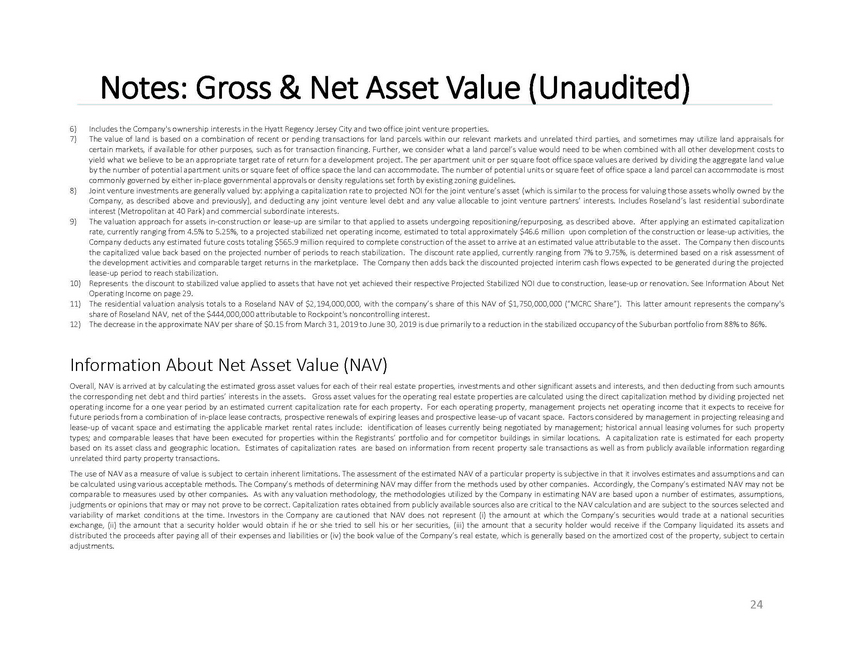 Notes: Gross & Net Asset Va lue (Unaudited) 6) 7) Includes the Company's ownership interests in the Hyatt Regency Jersey City and two office joint venture properties. The value of land is based on a combination of recent or pending transactions for land parcels within our relevant markets and unrelated third parties, and sometimes may utilize land appraisals for certain markets, if available for other purposes, such as for transaction financing. Further, we consider what a land parcel’s value would need to be when combined with all other development costs to yield what we believe to be an appropriate target rate of return for a development project. The per apartment unit or per square foot office space values are derived by dividing the aggregate land value by the number of potential apartment units or square feet of office space the land can accommodate. The number of potential units or square feet of office space a land parcel can accommodate is most commonly governed by either in-place governmental approvals or density regulations set forth by existing zoning guidelines. Joint venture investments are generally valued by: applying a capitalization rate to projected NOI for the joint venture’s asset (which is similar to the process for valuing those assets wholly owned by the Company, as described above and previously), and deducting any joint venture level debt and any value allocable to joint venture partners’ interests. Includes Roseland’s last residential subordinate interest (Metropolitan at 40 Park) and commercial subordinate interests. The valuation approach for assets in-construction or lease-up are similar to that applied to assets undergoing repositioning/repurposing, as described above. After applying an estimated capitalization rate, currently ranging from 4.5% to 5.25%, to a projected stabilized net operating income, estimated to total approximately $46.6 million upon completion of the construction or lease-up activities, the Company deducts any estimated future costs totaling $565.9 million required to complete construction of the asset to arrive at an estimated value attributable to the asset. The Company then discounts the capitalized value back based on the projected number of periods to reach stabilization. The discount rate applied, currently ranging from 7% to 9.75%, is determined based on a risk assessment of the development activities and comparable target returns in the marketplace. The Company then adds back the discounted projected interim cash flows expected to be generated during the projected lease-up period to reach stabilization. Represents the discount to stabilized value applied to assets that have not yet achieved their respective Projected Stabilized NOI due to construction, lease-up or renovation. See Information About Net Operating Income on page 29. The residential valuation analysis totals to a Roseland NAV of $2,194,000,000, with the company’s share of this NAV of $1,750,000,000 (“MCRC Share”). This latter amount represents the company's share of Roseland NAV, net of the $444,000,000 attributable to Rockpoint's noncontrolling interest. The decrease in the approximate NAV per share of $0.15 from March 31, 2019 to June 30, 2019 is due primarily to a reduction in the stabilized occupancy of the Suburban portfolio from 88% to 86%. 8) 9) 10) 11) 12) Information About Net Asset Value (NAV) Overall, NAV is arrived at by calculating the estimated gross asset values for each of their real estate properties, investments and other significant assets and interests, and then deducting from such amounts the corresponding net debt and third parties’ interests in the assets. Gross asset values for the operating real estate properties are calculated using the direct capitalization method by dividing projected net operating income for a one year period by an estimated current capitalization rate for each property. For each operating property, management projects net operating income that it expects to receive for future periods from a combination of in-place lease contracts, prospective renewals of expiring leases and prospective lease-up of vacant space. Factors considered by management in projecting releasing and lease-up of vacant space and estimating the applicable market rental rates include: identification of leases currently being negotiated by management; historical annual leasing volumes for such property types; and comparable leases that have been executed for properties within the Registrants’ portfolio and for competitor buildings in similar locations. A capitalization rate is estimated for each property based on its asset class and geographic location. Estimates of capitalization rates are based on information from recent property sale transactions as well as from publicly available information regarding unrelated third party property transactions. The use of NAV as a measure of value is subject to certain inherent limitations. The assessment of the estimated NAV of a particular property is subjective in that it involves estimates and assumptions and can be calculated using various acceptable methods. The Company’s methods of determining NAV may differ from the methods used by other companies. Accordingly, the Company’s estimated NAV may not be comparable to measures used by other companies. As with any valuation methodology, the methodologies utilized by the Company in estimating NAV are based upon a number of estimates, assumptions, judgments or opinions that may or may not prove to be correct. Capitalization rates obtained from publicly available sources also are critical to the NAV calculation and are subject to the sources selected and variability of market conditions at the time. Investors in the Company are cautioned that NAV does not represent (i) the amount at which the Company’s securities would trade at a national securities exchange, (ii) the amount that a security holder would obtain if he or she tried to sell his or
